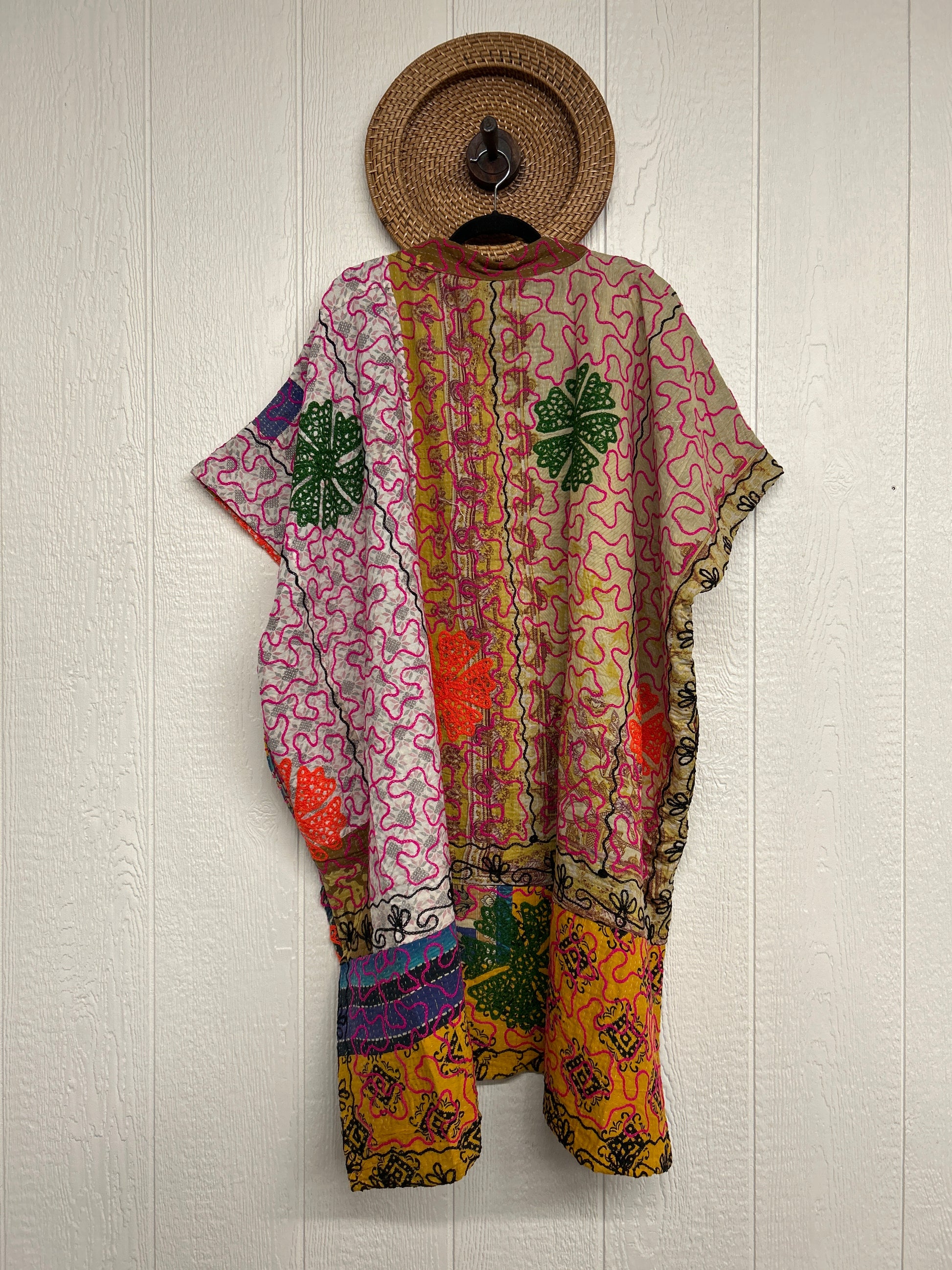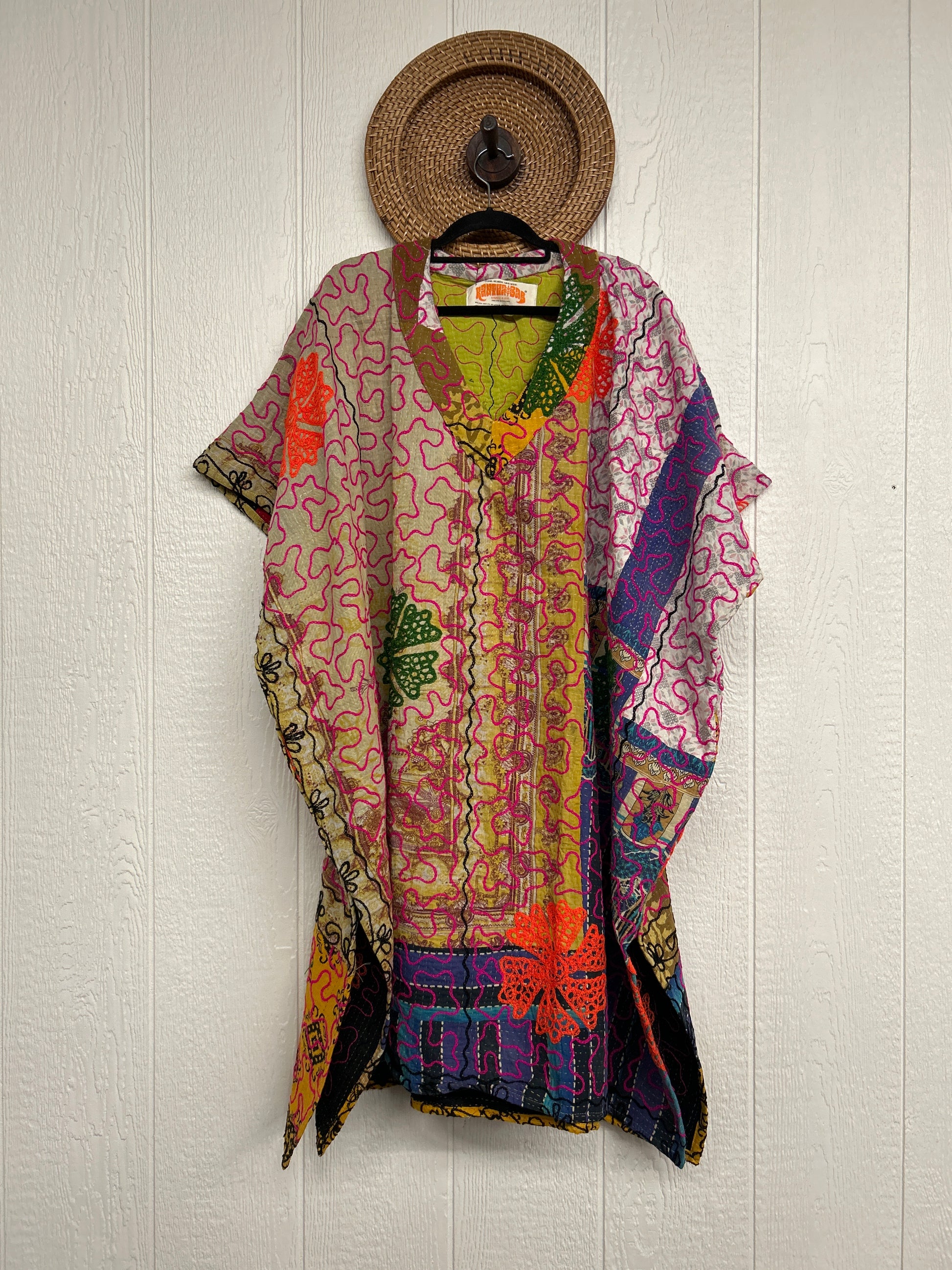 Crafted from hand embroidered fine kantha features a v neckline and interior pockets and side slits for extra dimension.