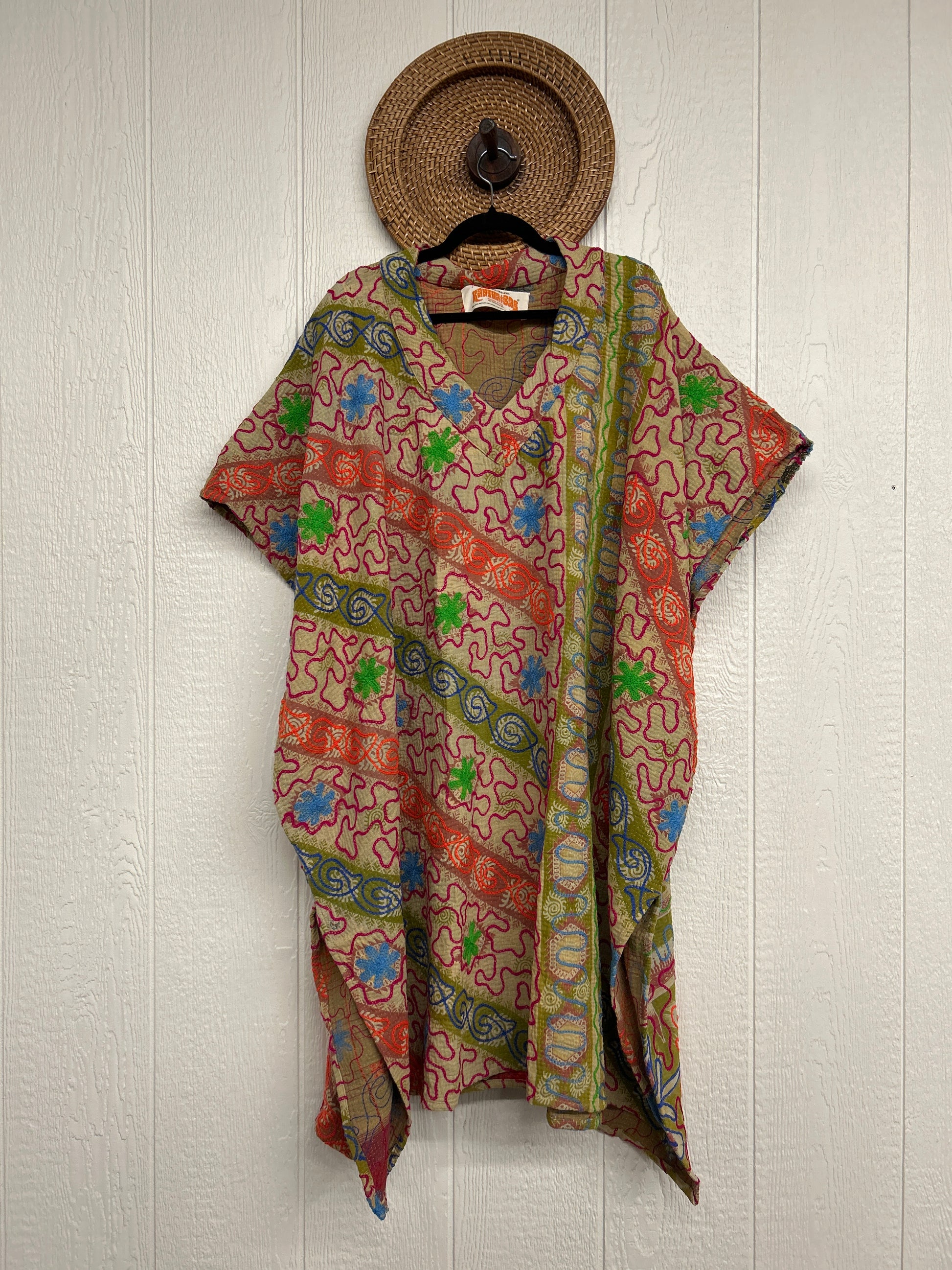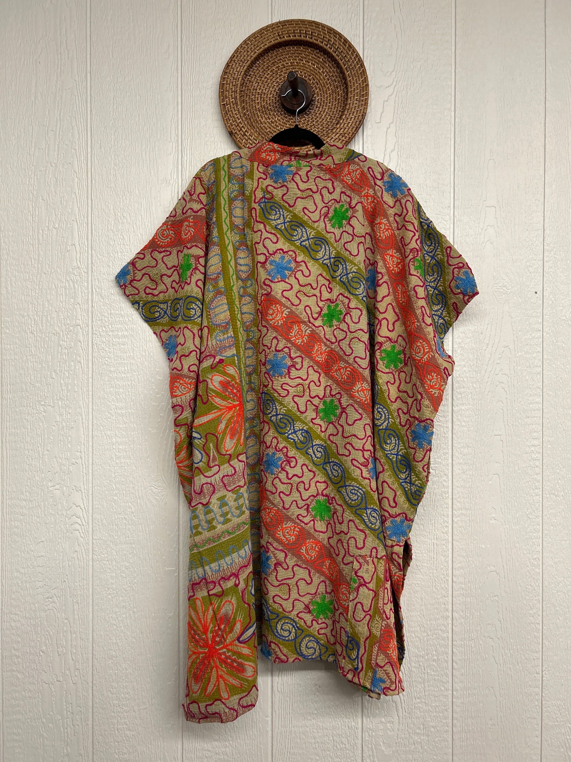 Crafted from hand embroidered fine kantha features a v neckline and interior pockets and side slits for extra dimension.