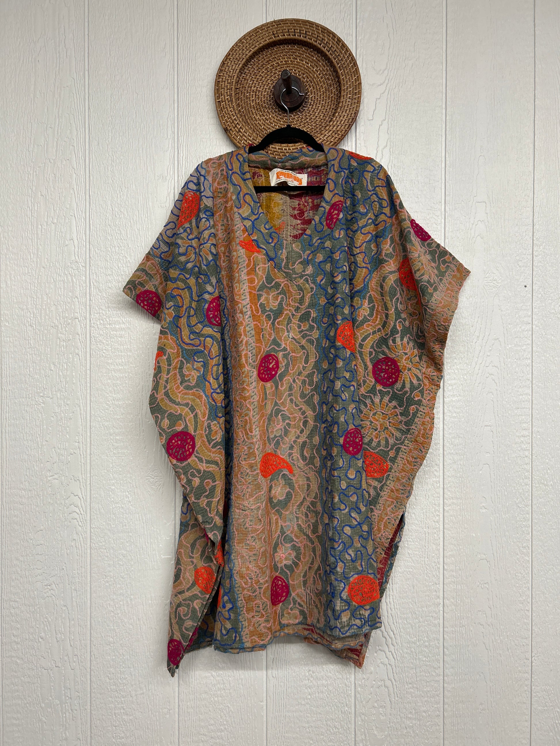 Crafted from hand embroidered fine kantha features a v neckline and interior pockets and side slits for extra dimension.
