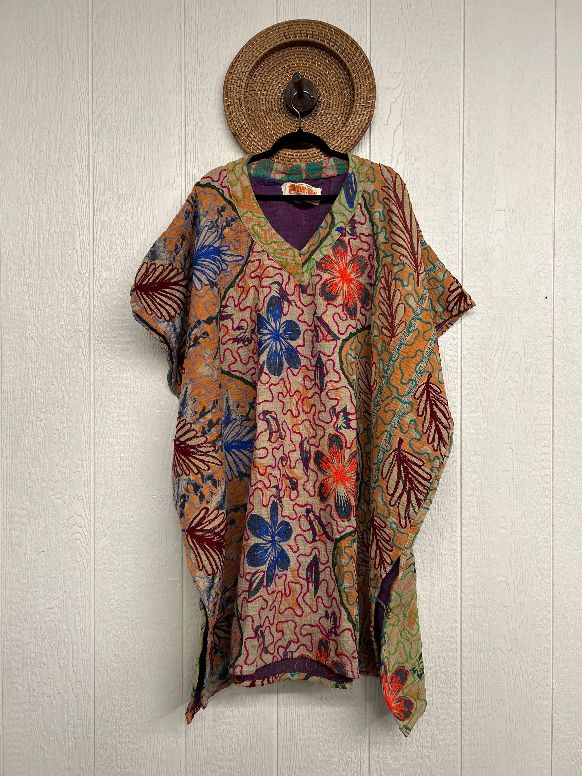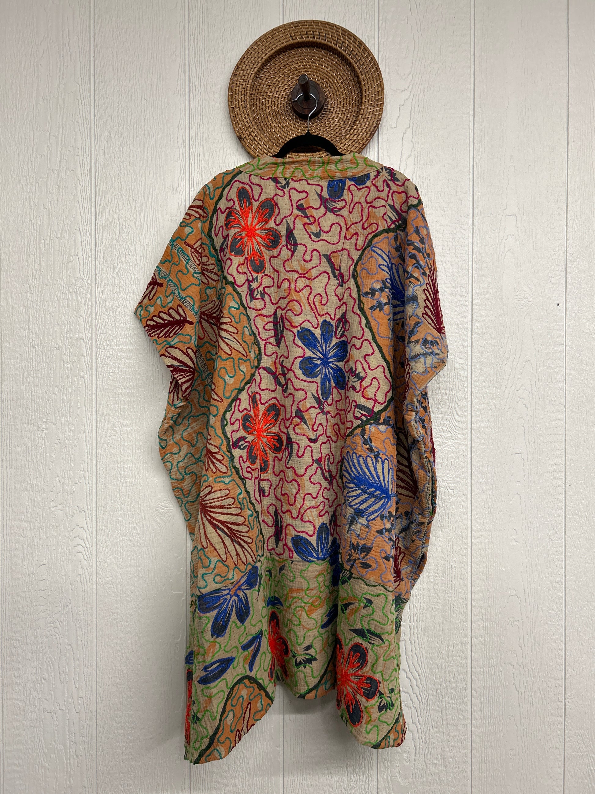 Crafted from hand embroidered fine kantha features a v neckline and interior pockets and side slits for extra dimension.