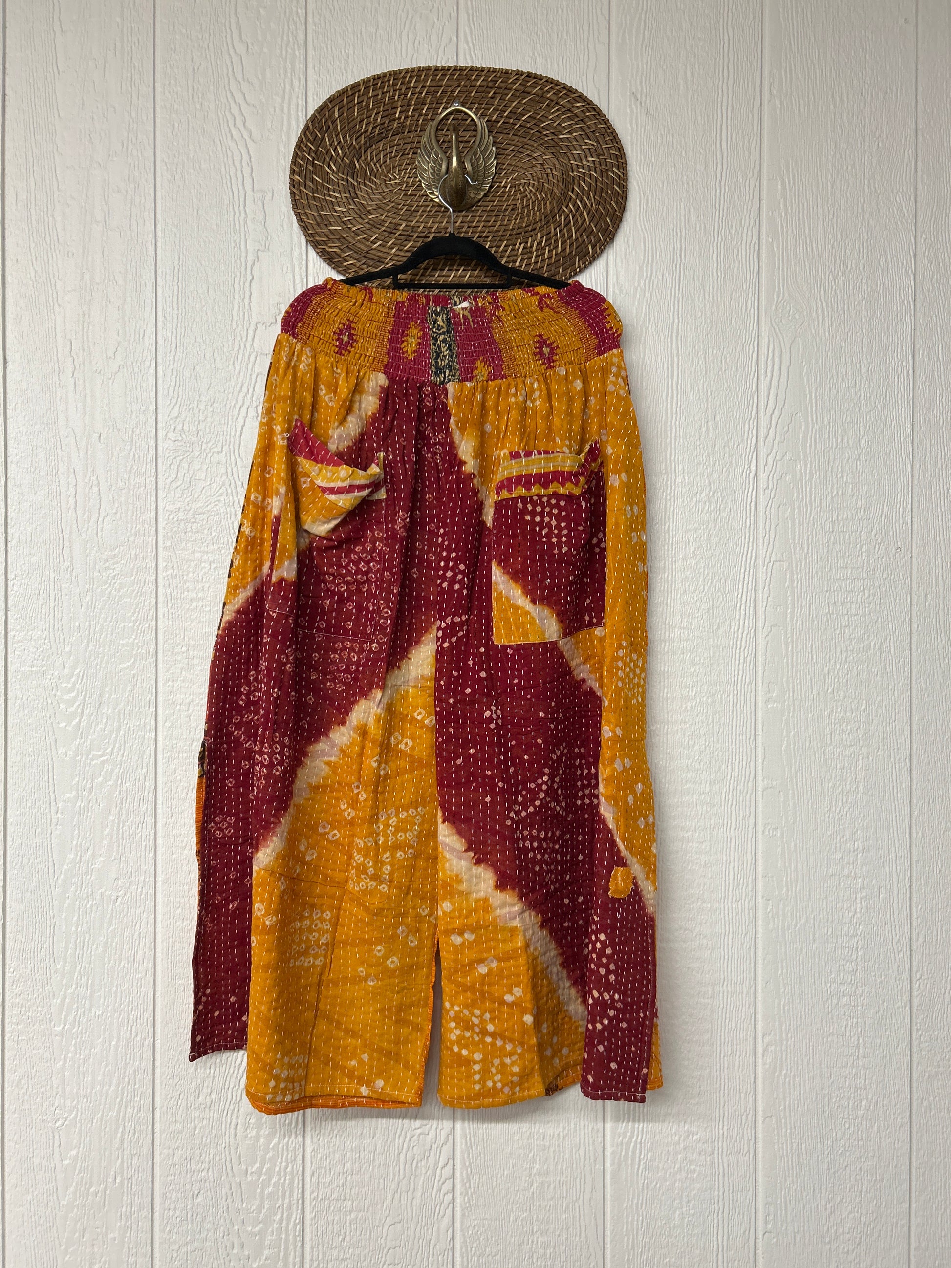 Fabrics may have small threads or holes in the layers. Color inconsistency or small stains may be present. The saris are sewn together and extend the life of each design.