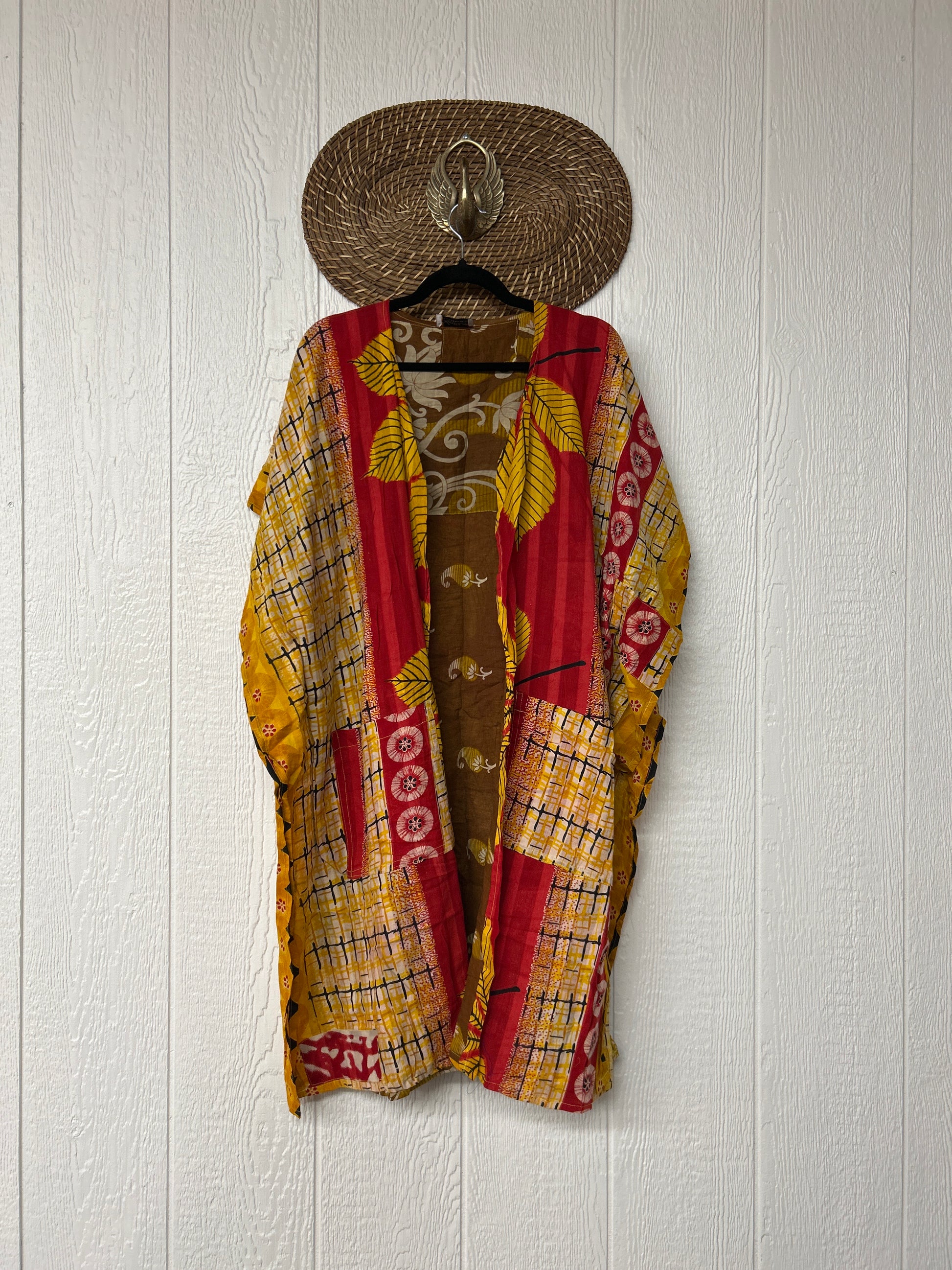 The Take It Easy Summer Kimono is next level comfort. Double vintage cotton sari, fully reversible, slouchy pockets inside and outside and side slits for extra dimension.
