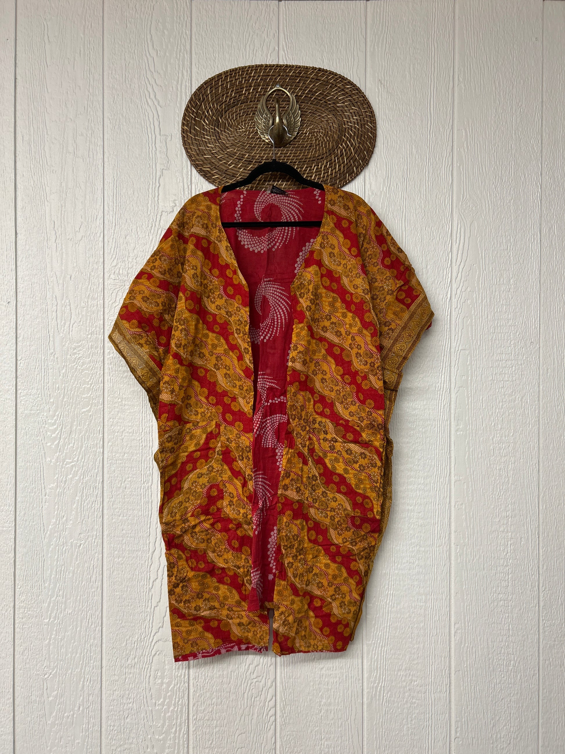 The Take It Easy Summer Kimono is next level comfort. Double vintage cotton sari, fully reversible, slouchy pockets inside and outside and side slits for extra dimension.