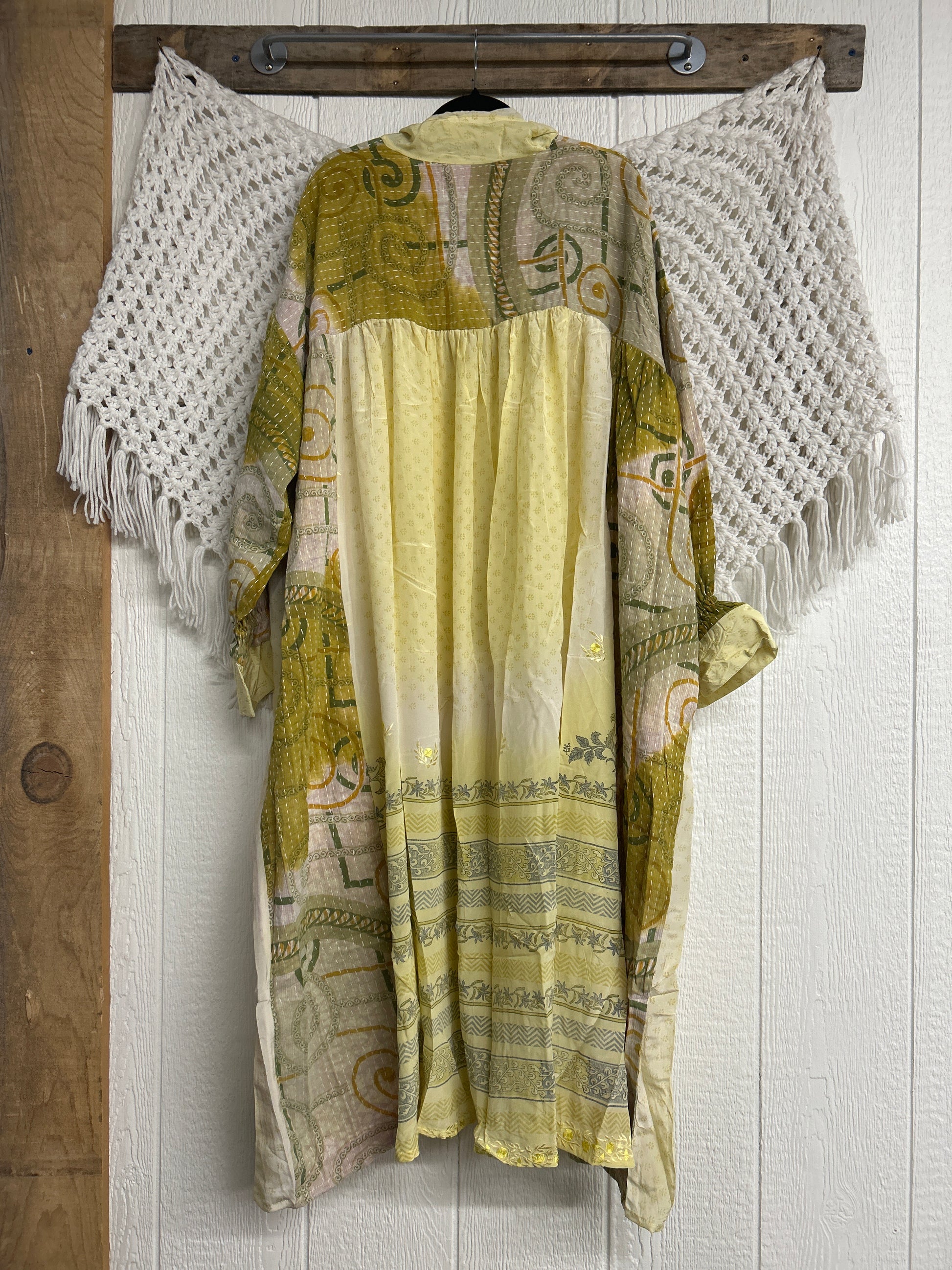 This dream layering piece is made from a mix of our lux vintage kantha embroidered cotton and crepe sari. Features an elastic ruffle sleeve that is easy to pull up or down to your desired length.