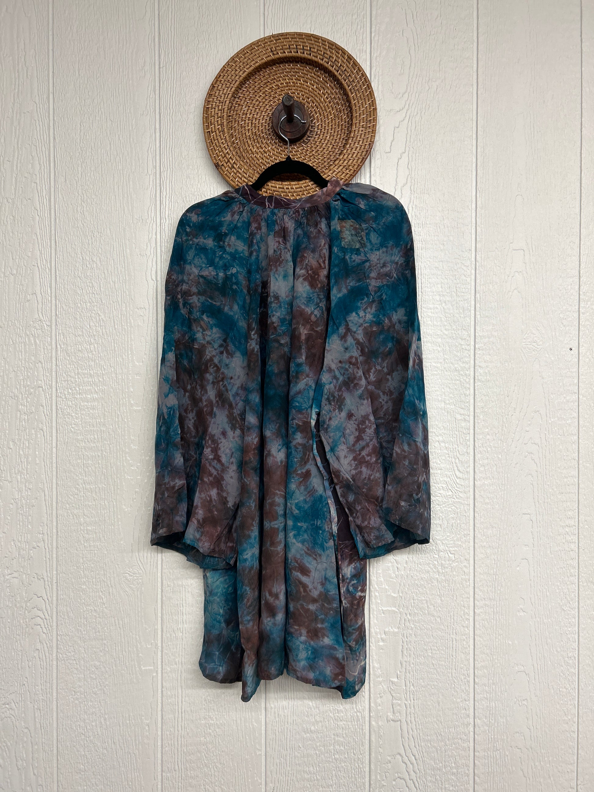 This floaty wonder is made from our ultra lux vintage crepe sari. Our India team has hand tie dyed these unique pieces in the dreamiest colors. The Woodstock Shortie Kimono can be buttoned up as a dress or worn open as the vibiest kimono. Wide bell sleeves make this statement piece the ultimate vibe!
