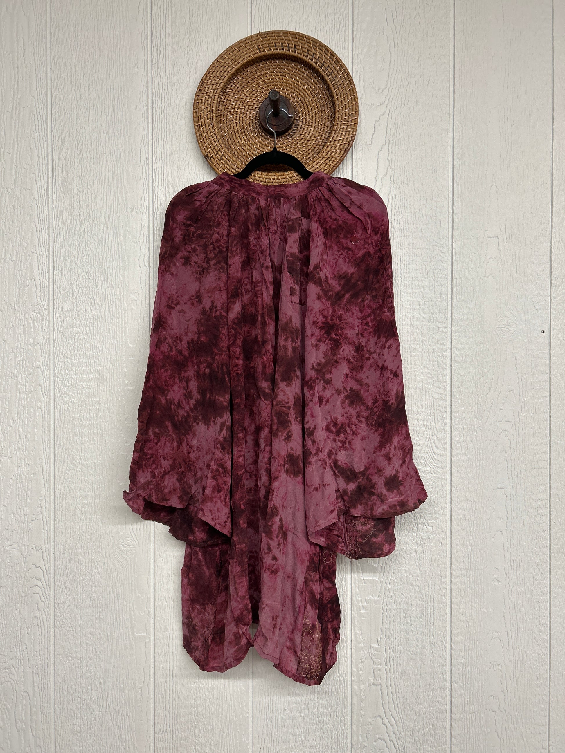 This floaty wonder is made from our ultra lux vintage crepe sari. Our India team has hand tie dyed these unique pieces in the dreamiest colors. The Woodstock Shortie Kimono can be buttoned up as a dress or worn open as the vibiest kimono. Wide bell sleeves make this statement piece the ultimate vibe!