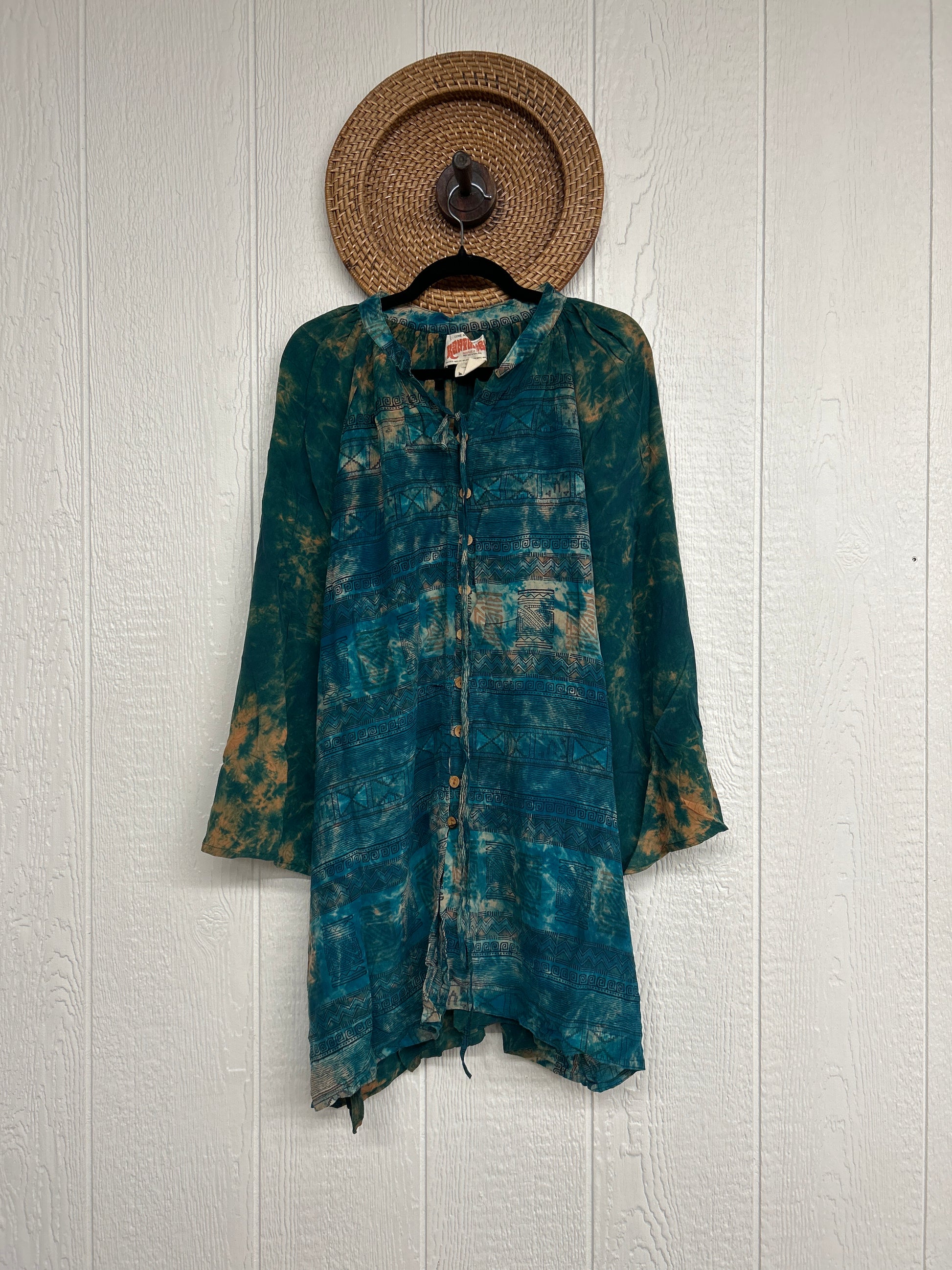 This floaty wonder is made from our ultra lux vintage crepe sari. Our India team has hand tie dyed these unique pieces in the dreamiest colors. The Woodstock Shortie Kimono can be buttoned up as a dress or worn open as the vibiest kimono. Wide bell sleeves make this statement piece the ultimate vibe!