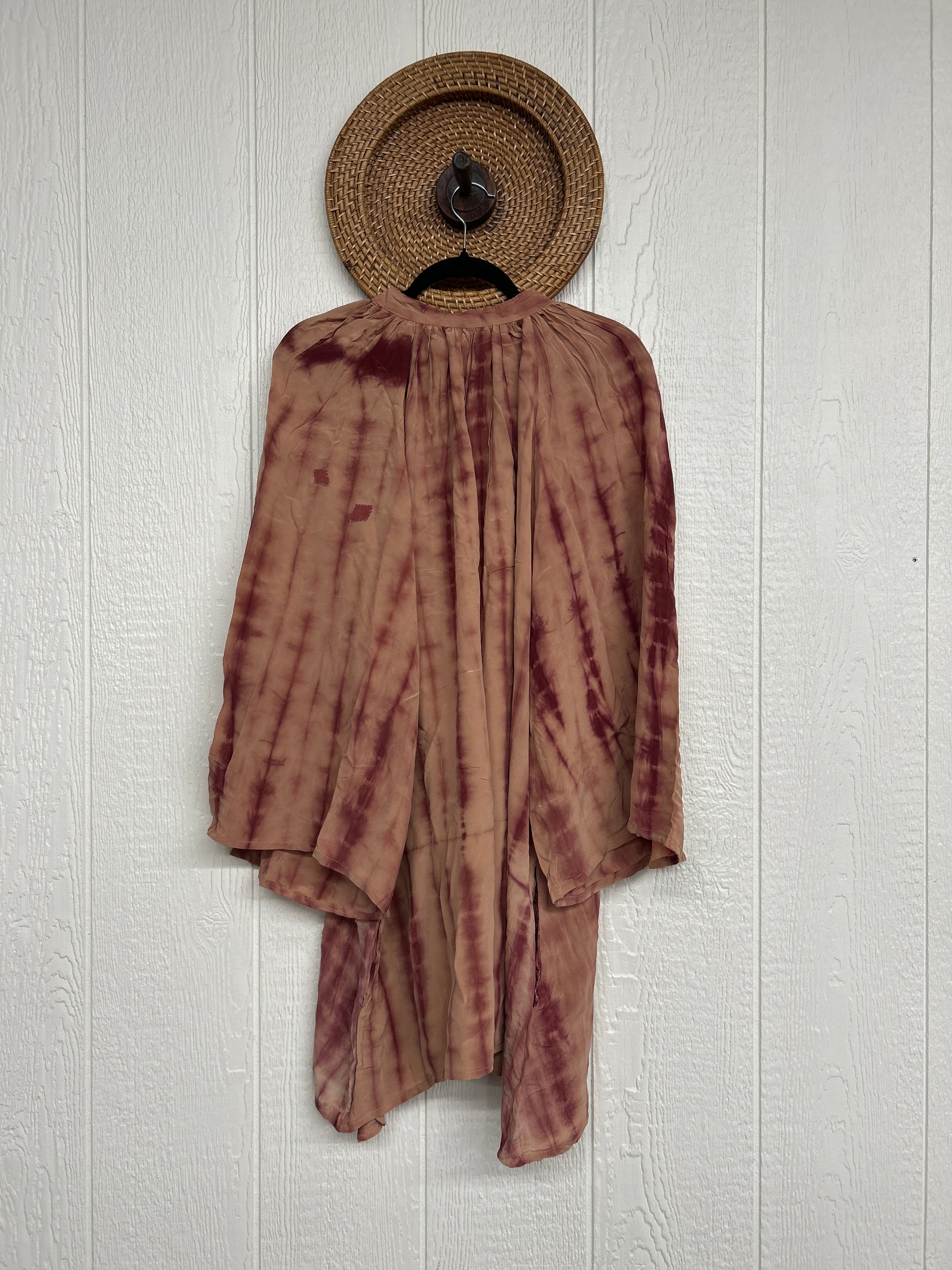 This floaty wonder is made from our ultra lux vintage crepe sari. Our India team has hand tie dyed these unique pieces in the dreamiest colors. The Woodstock Shortie Kimono can be buttoned up as a dress or worn open as the vibiest kimono. Wide bell sleeves make this statement piece the ultimate vibe!