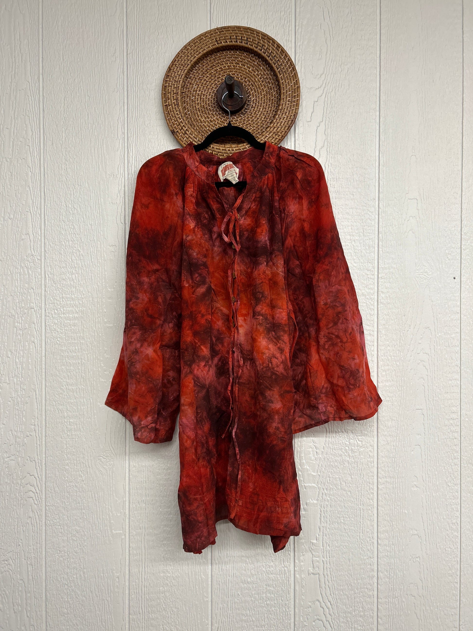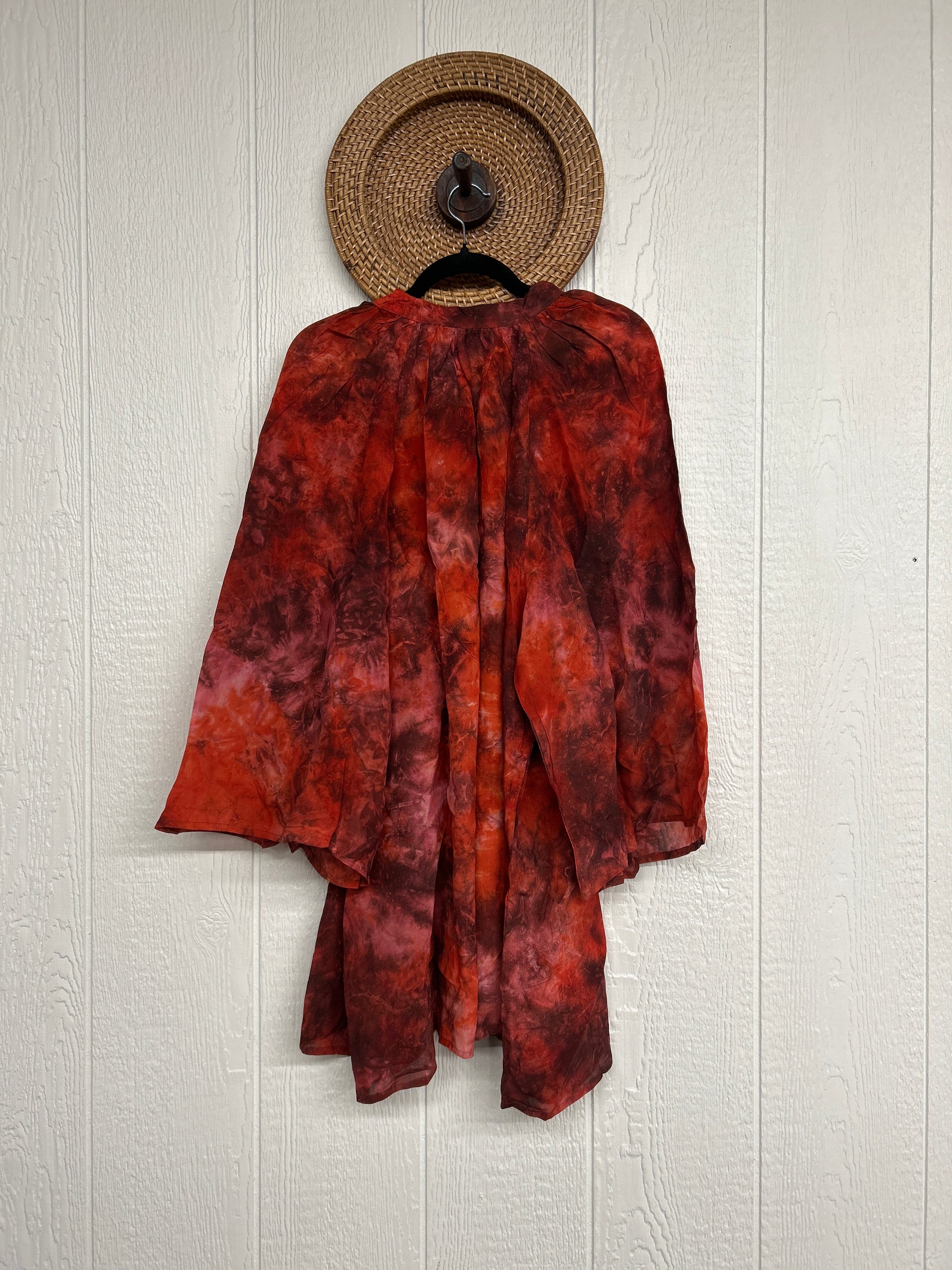 This floaty wonder is made from our ultra lux vintage crepe sari. Our India team has hand tie dyed these unique pieces in the dreamiest colors. The Woodstock Shortie Kimono can be buttoned up as a dress or worn open as the vibiest kimono. Wide bell sleeves make this statement piece the ultimate vibe!