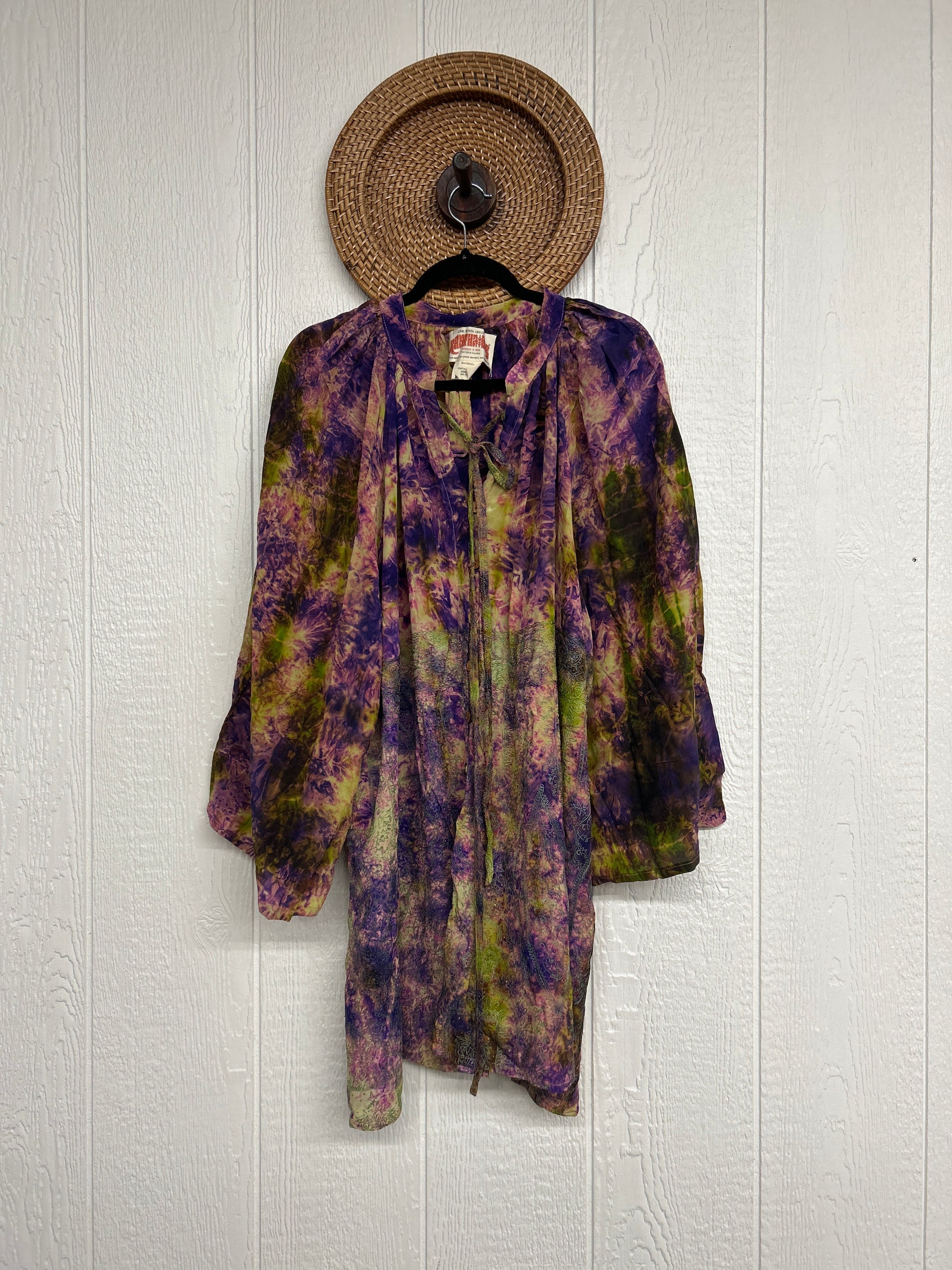 This floaty wonder is made from our ultra lux vintage crepe sari. Our India team has hand tie dyed these unique pieces in the dreamiest colors. The Woodstock Shortie Kimono can be buttoned up as a dress or worn open as the vibiest kimono. Wide bell sleeves make this statement piece the ultimate vibe!