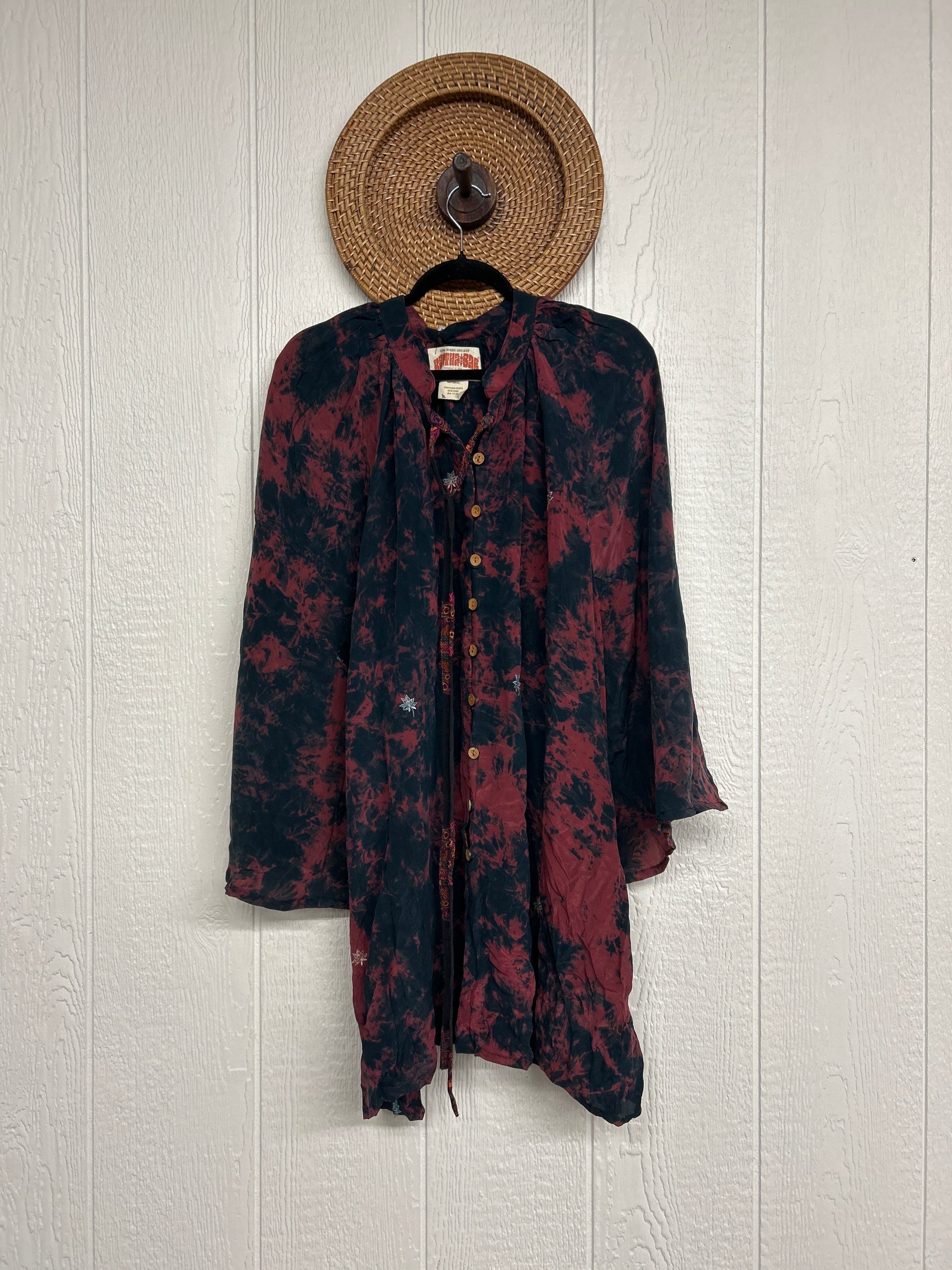 This floaty wonder is made from our ultra lux vintage crepe sari. Our India team has hand tie dyed these unique pieces in the dreamiest colors. The Woodstock Shortie Kimono can be buttoned up as a dress or worn open as the vibiest kimono. Wide bell sleeves make this statement piece the ultimate vibe!