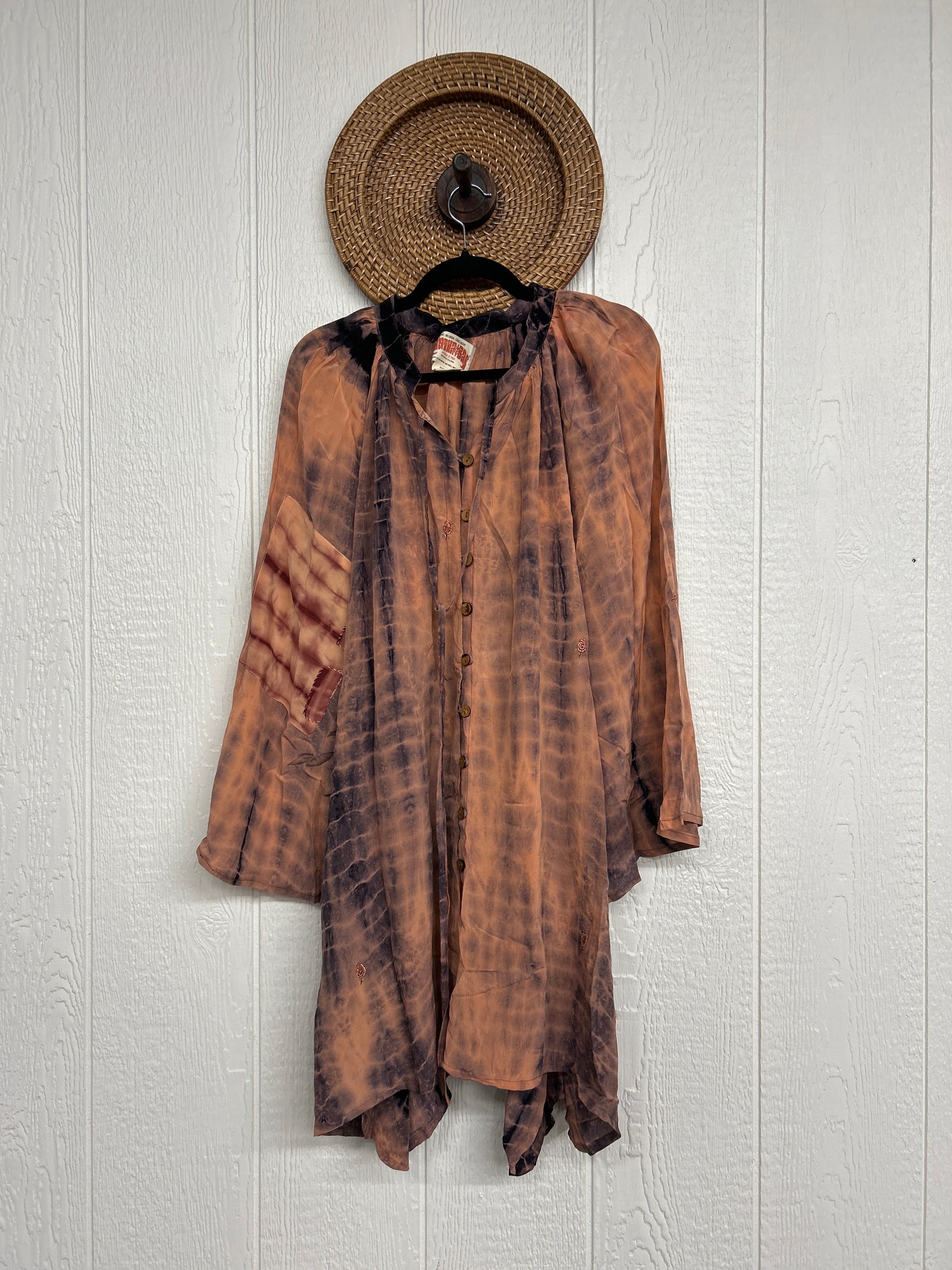 This floaty wonder is made from our ultra lux vintage crepe sari. Our India team has hand tie dyed these unique pieces in the dreamiest colors. The Woodstock Shortie Kimono can be buttoned up as a dress or worn open as the vibiest kimono. Wide bell sleeves make this statement piece the ultimate vibe!