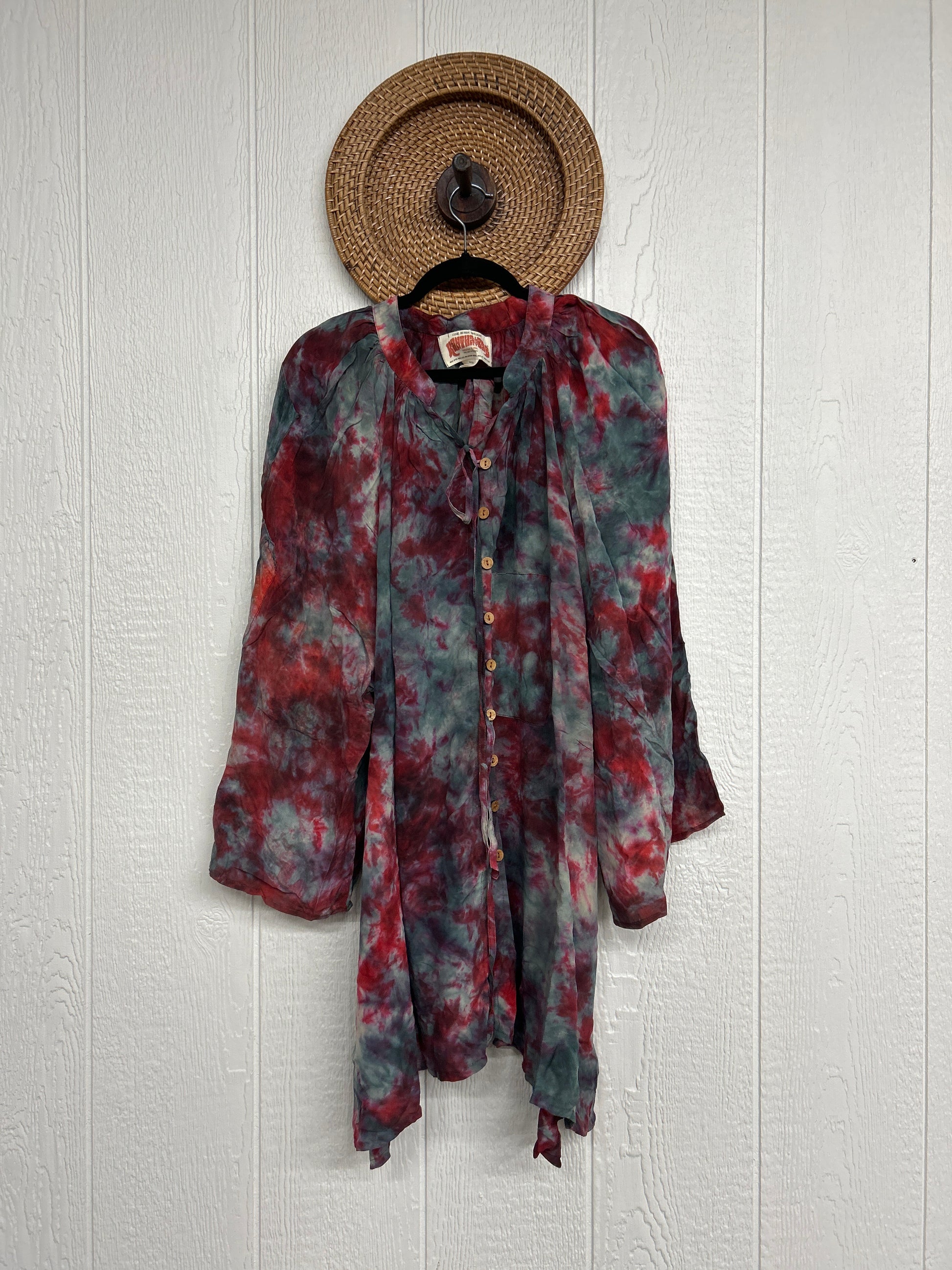 This floaty wonder is made from our ultra lux vintage crepe sari. Our India team has hand tie dyed these unique pieces in the dreamiest colors. The Woodstock Shortie Kimono can be buttoned up as a dress or worn open as the vibiest kimono. Wide bell sleeves make this statement piece the ultimate vibe!