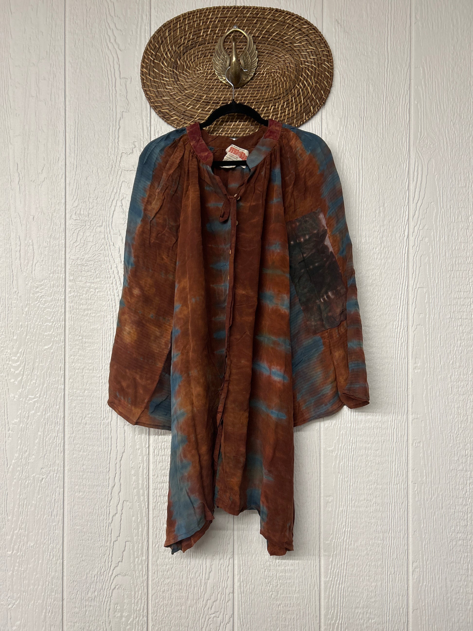 This floaty wonder is made from our ultra lux vintage crepe sari. Our India team has hand tie dyed these unique pieces in the dreamiest colors. The Woodstock Shortie Kimono can be buttoned up as a dress or worn open as the vibiest kimono. Wide bell sleeves make this statement piece the ultimate vibe!