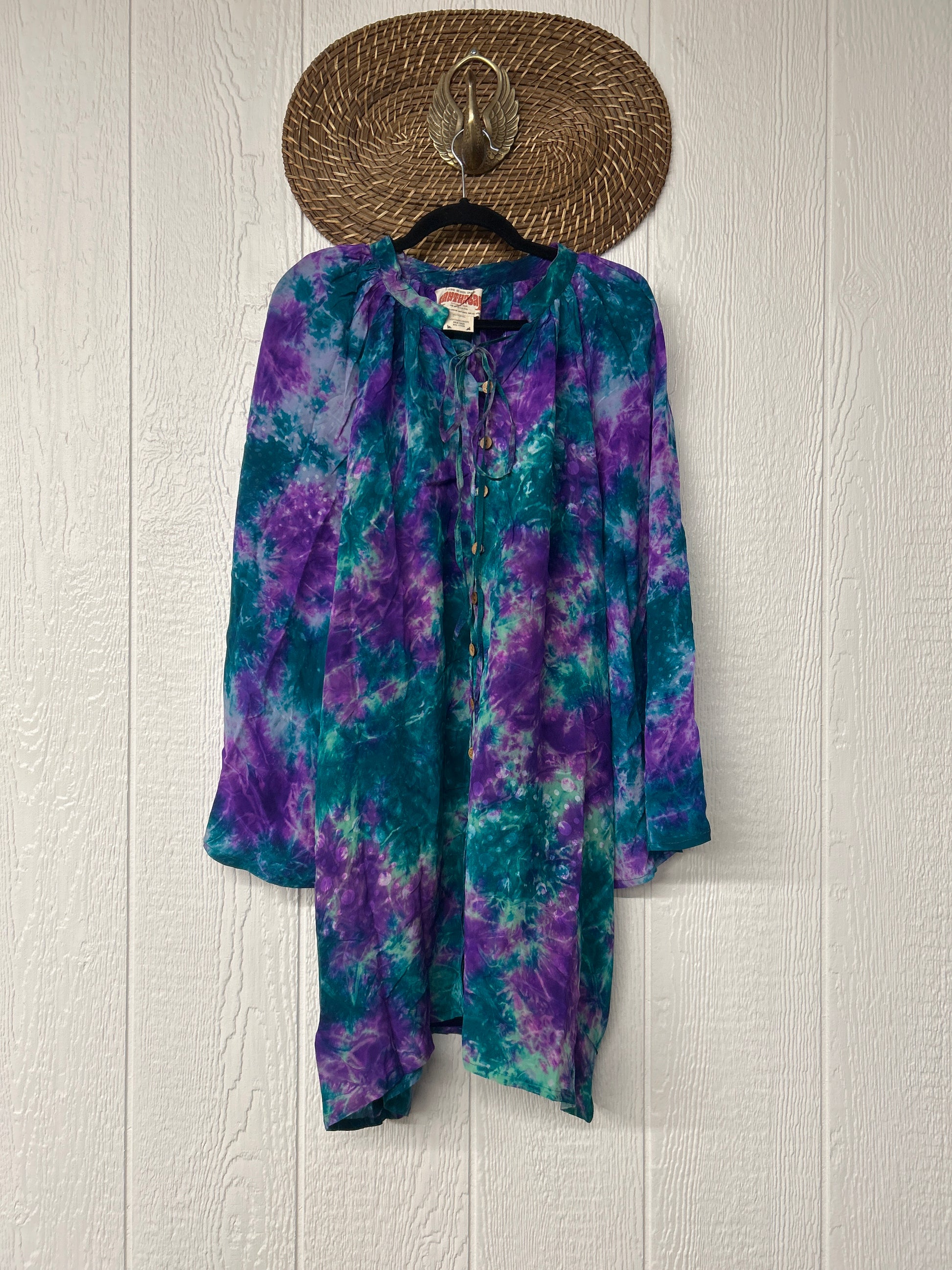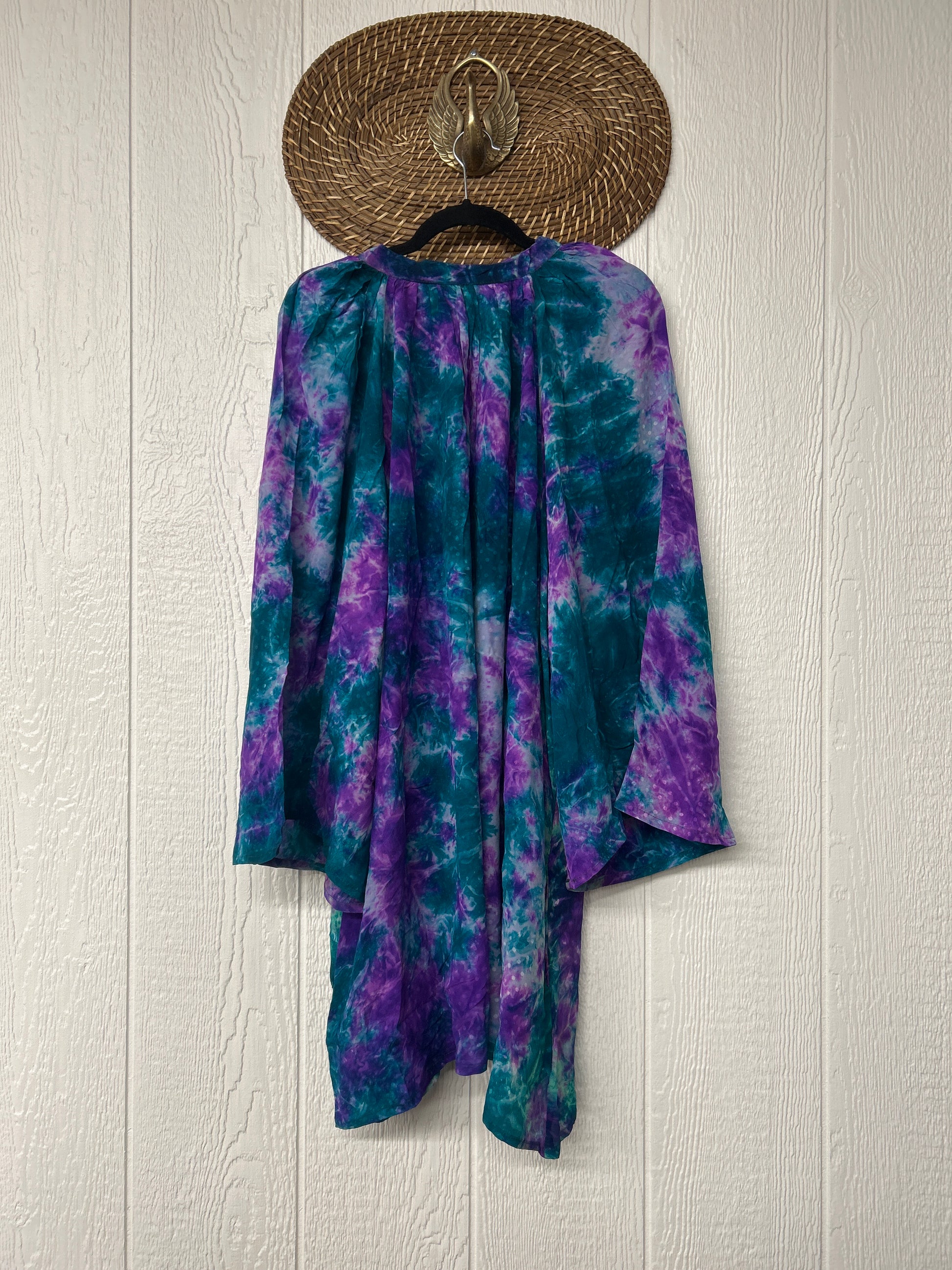 This floaty wonder is made from our ultra lux vintage crepe sari. Our India team has hand tie dyed these unique pieces in the dreamiest colors. The Woodstock Shortie Kimono can be buttoned up as a dress or worn open as the vibiest kimono. Wide bell sleeves make this statement piece the ultimate vibe!