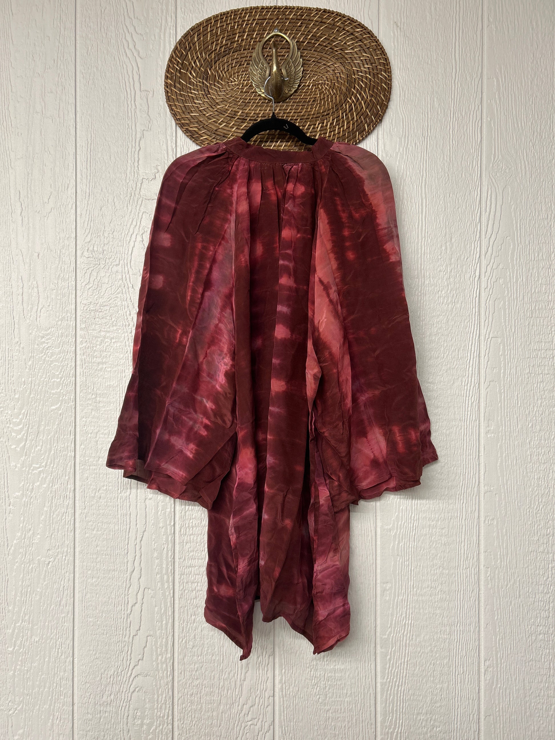This floaty wonder is made from our ultra lux vintage crepe sari. Our India team has hand tie dyed these unique pieces in the dreamiest colors. The Woodstock Shortie Kimono can be buttoned up as a dress or worn open as the vibiest kimono. Wide bell sleeves make this statement piece the ultimate vibe!