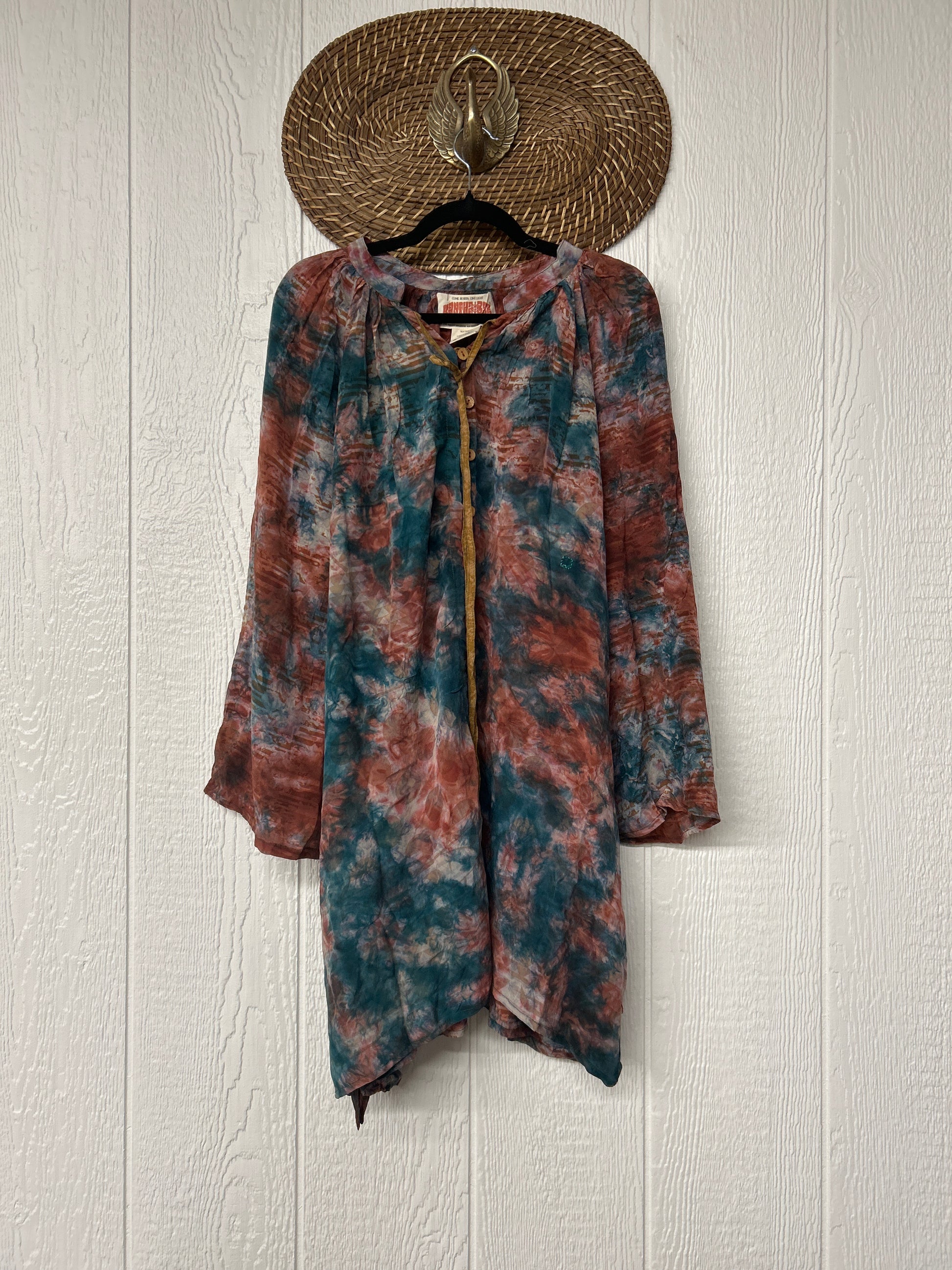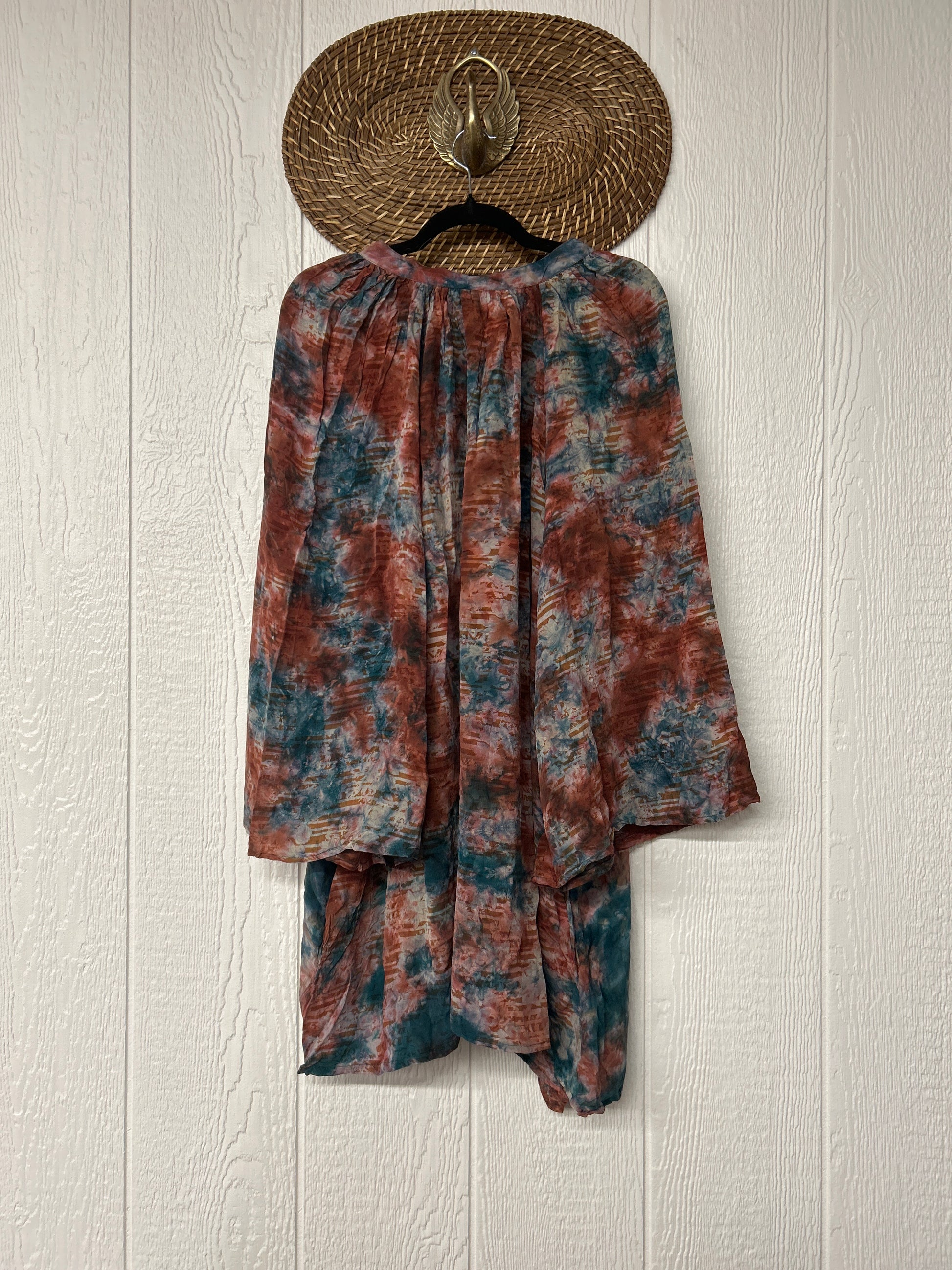 This floaty wonder is made from our ultra lux vintage crepe sari. Our India team has hand tie dyed these unique pieces in the dreamiest colors. The Woodstock Shortie Kimono can be buttoned up as a dress or worn open as the vibiest kimono. Wide bell sleeves make this statement piece the ultimate vibe!