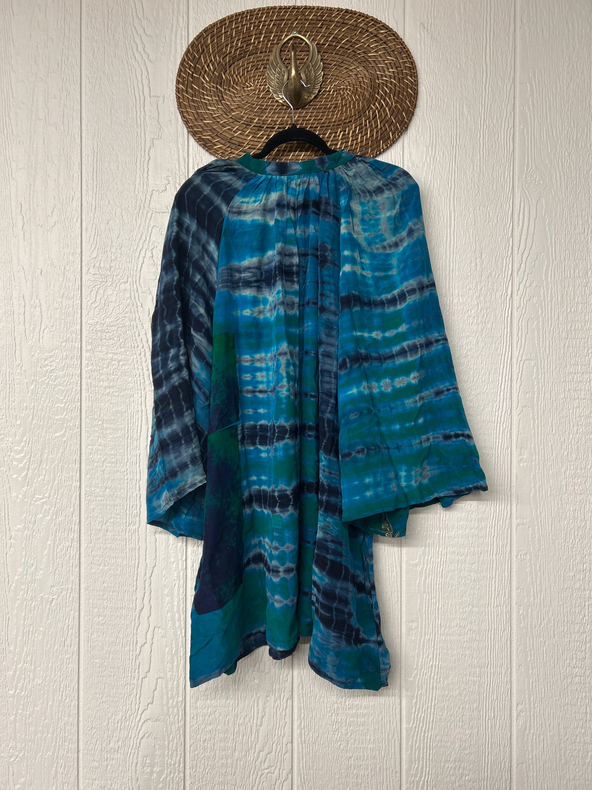 This floaty wonder is made from our ultra lux vintage crepe sari. Our India team has hand tie dyed these unique pieces in the dreamiest colors. The Woodstock Shortie Kimono can be buttoned up as a dress or worn open as the vibiest kimono. Wide bell sleeves make this statement piece the ultimate vibe!