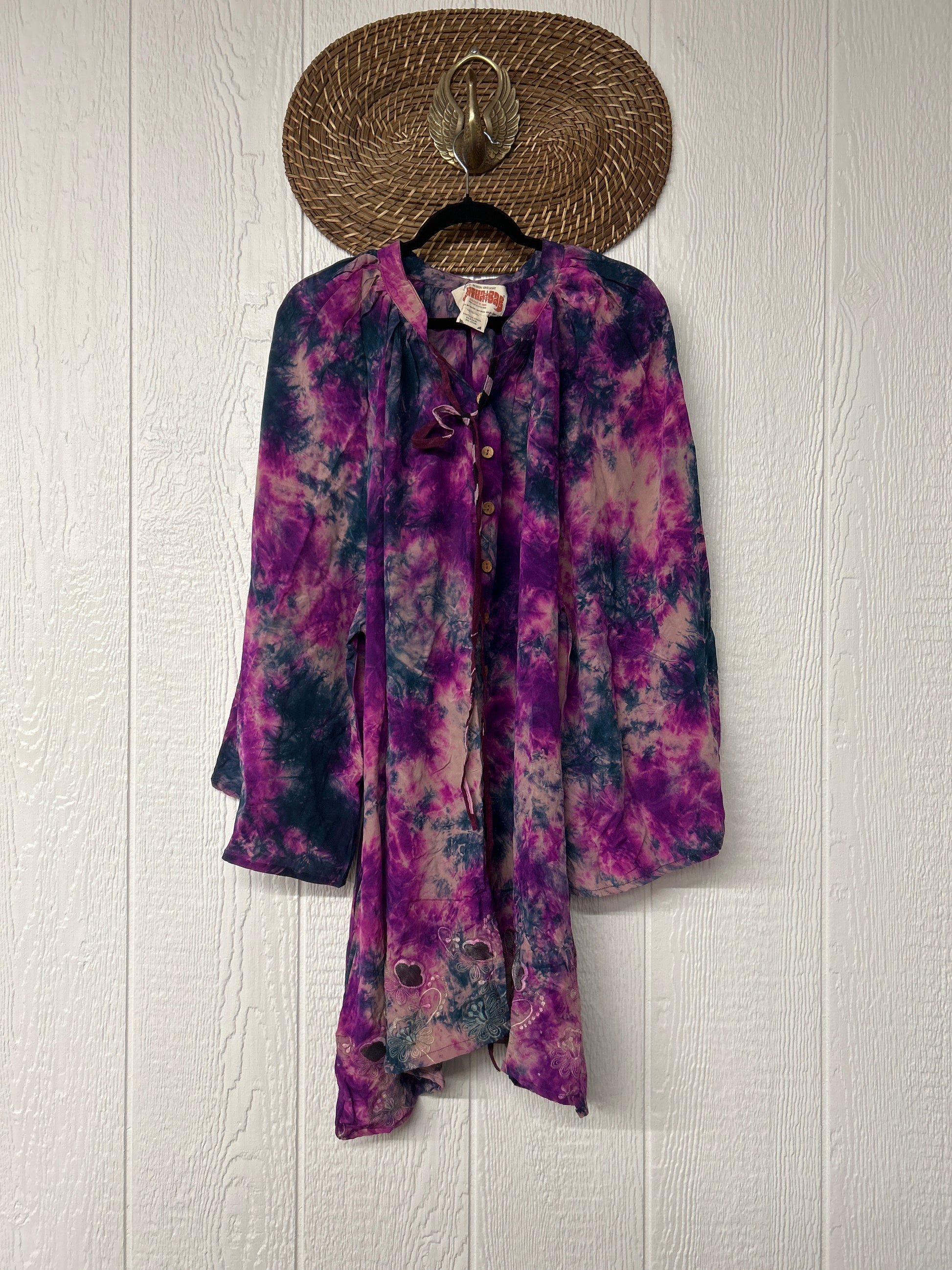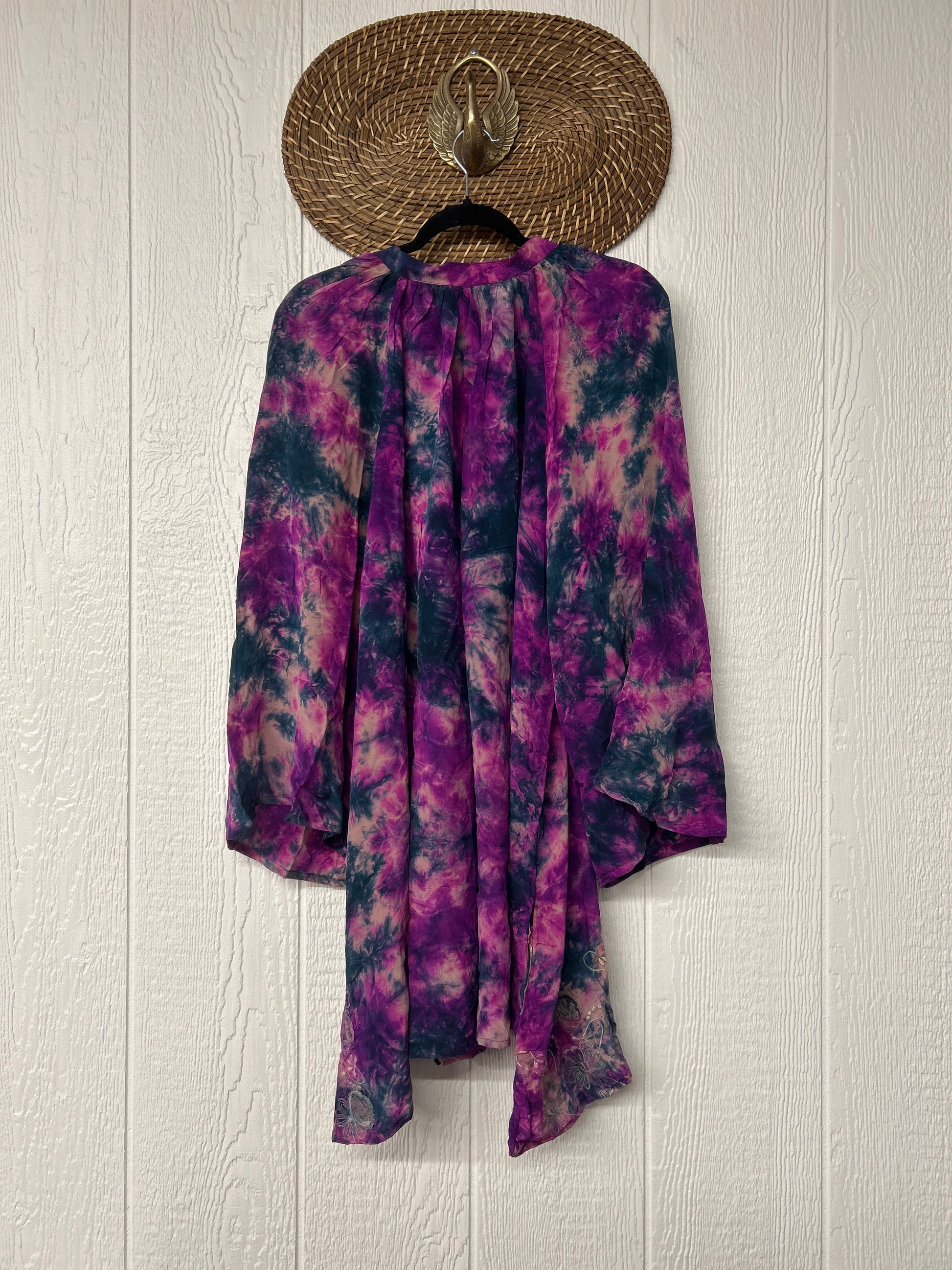 This floaty wonder is made from our ultra lux vintage crepe sari. Our India team has hand tie dyed these unique pieces in the dreamiest colors. The Woodstock Shortie Kimono can be buttoned up as a dress or worn open as the vibiest kimono. Wide bell sleeves make this statement piece the ultimate vibe!