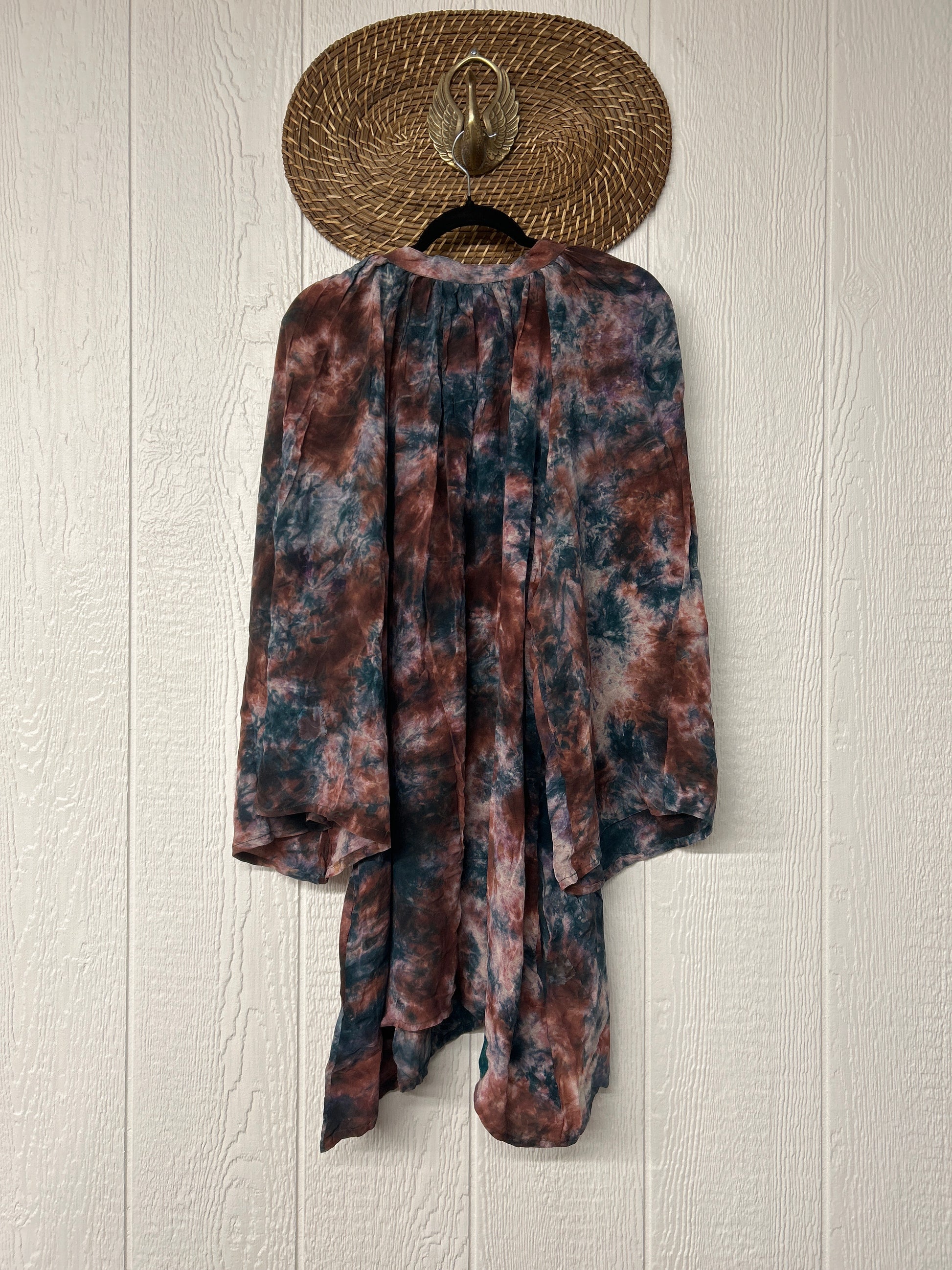 This floaty wonder is made from our ultra lux vintage crepe sari. Our India team has hand tie dyed these unique pieces in the dreamiest colors. The Woodstock Shortie Kimono can be buttoned up as a dress or worn open as the vibiest kimono. Wide bell sleeves make this statement piece the ultimate vibe!