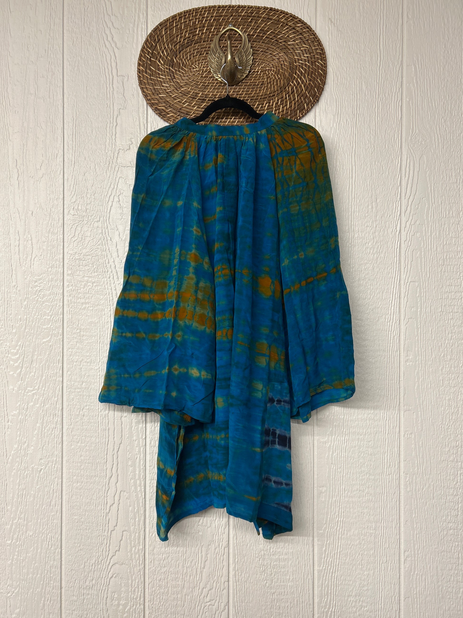 This floaty wonder is made from our ultra lux vintage crepe sari. Our India team has hand tie dyed these unique pieces in the dreamiest colors. The Woodstock Shortie Kimono can be buttoned up as a dress or worn open as the vibiest kimono. Wide bell sleeves make this statement piece the ultimate vibe!