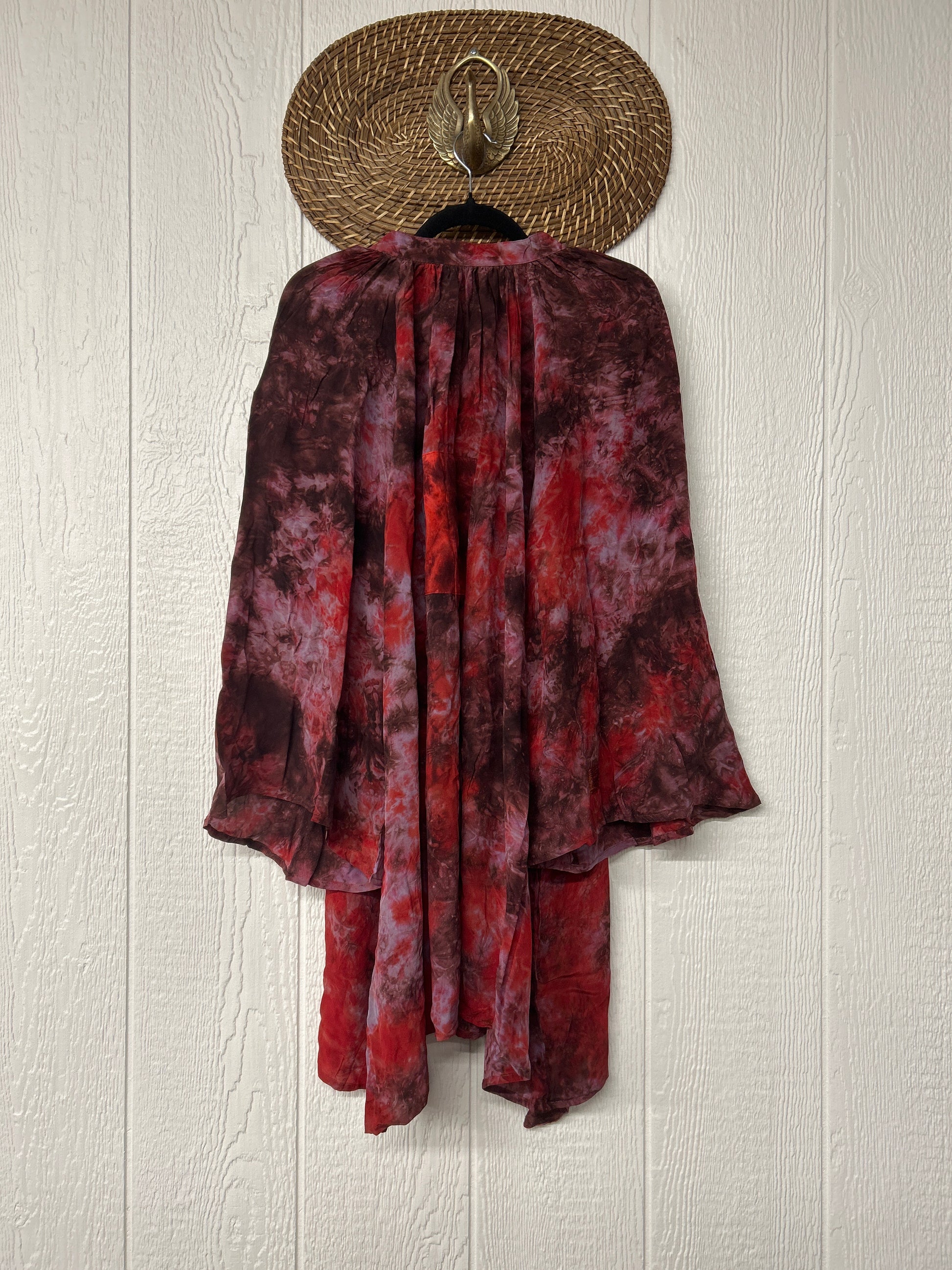 This floaty wonder is made from our ultra lux vintage crepe sari. Our India team has hand tie dyed these unique pieces in the dreamiest colors. The Woodstock Shortie Kimono can be buttoned up as a dress or worn open as the vibiest kimono. Wide bell sleeves make this statement piece the ultimate vibe!