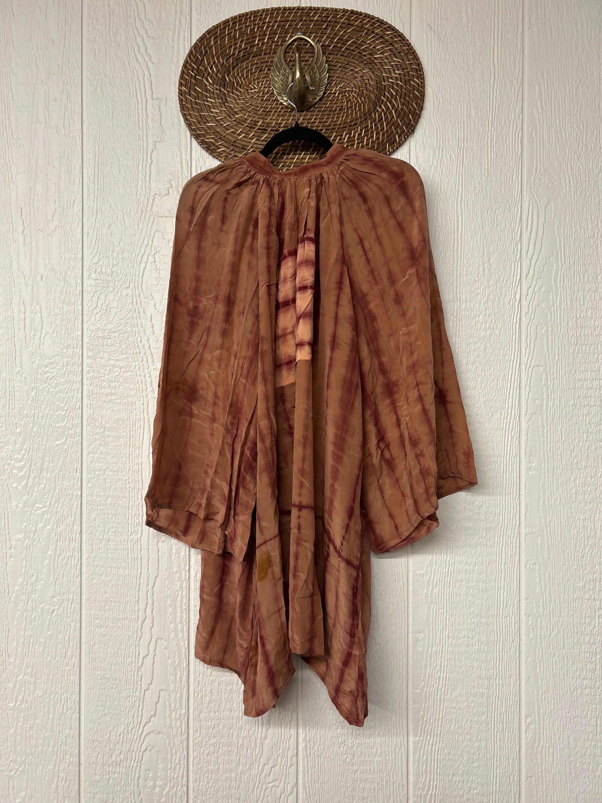 This floaty wonder is made from our ultra lux vintage crepe sari. Our India team has hand tie dyed these unique pieces in the dreamiest colors. The Woodstock Shortie Kimono can be buttoned up as a dress or worn open as the vibiest kimono. Wide bell sleeves make this statement piece the ultimate vibe!