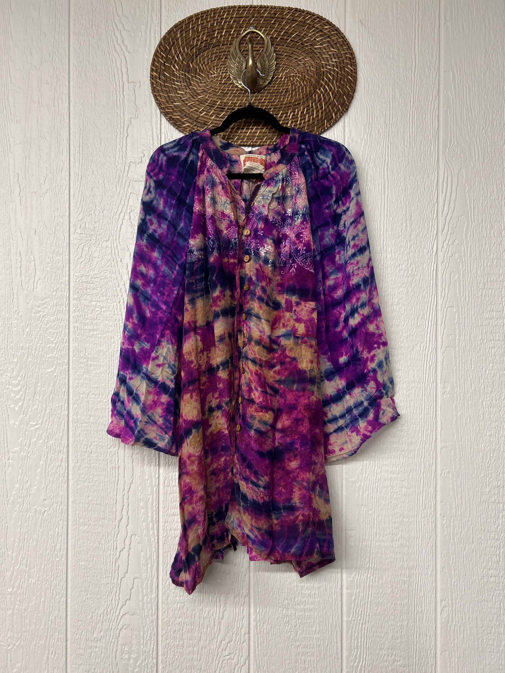 This floaty wonder is made from our ultra lux vintage crepe sari. Our India team has hand tie dyed these unique pieces in the dreamiest colors. The Woodstock Shortie Kimono can be buttoned up as a dress or worn open as the vibiest kimono. Wide bell sleeves make this statement piece the ultimate vibe!
