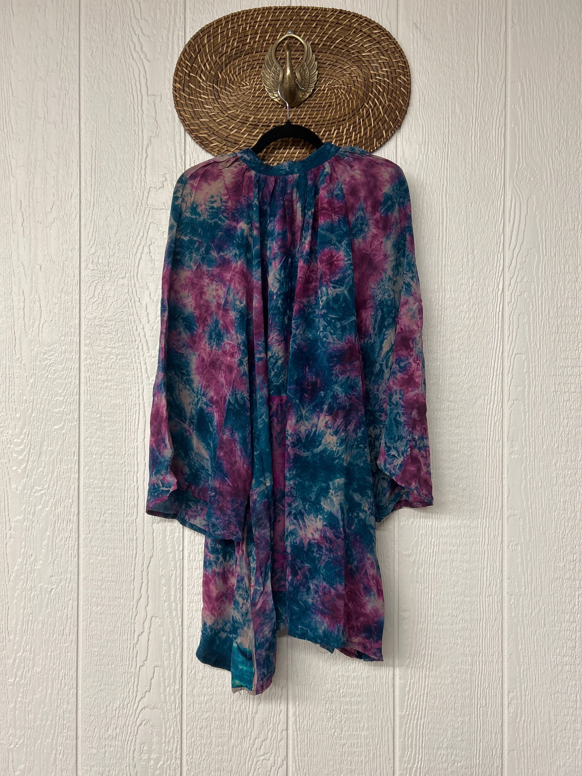 This floaty wonder is made from our ultra lux vintage crepe sari. Our India team has hand tie dyed these unique pieces in the dreamiest colors. The Woodstock Shortie Kimono can be buttoned up as a dress or worn open as the vibiest kimono. Wide bell sleeves make this statement piece the ultimate vibe!