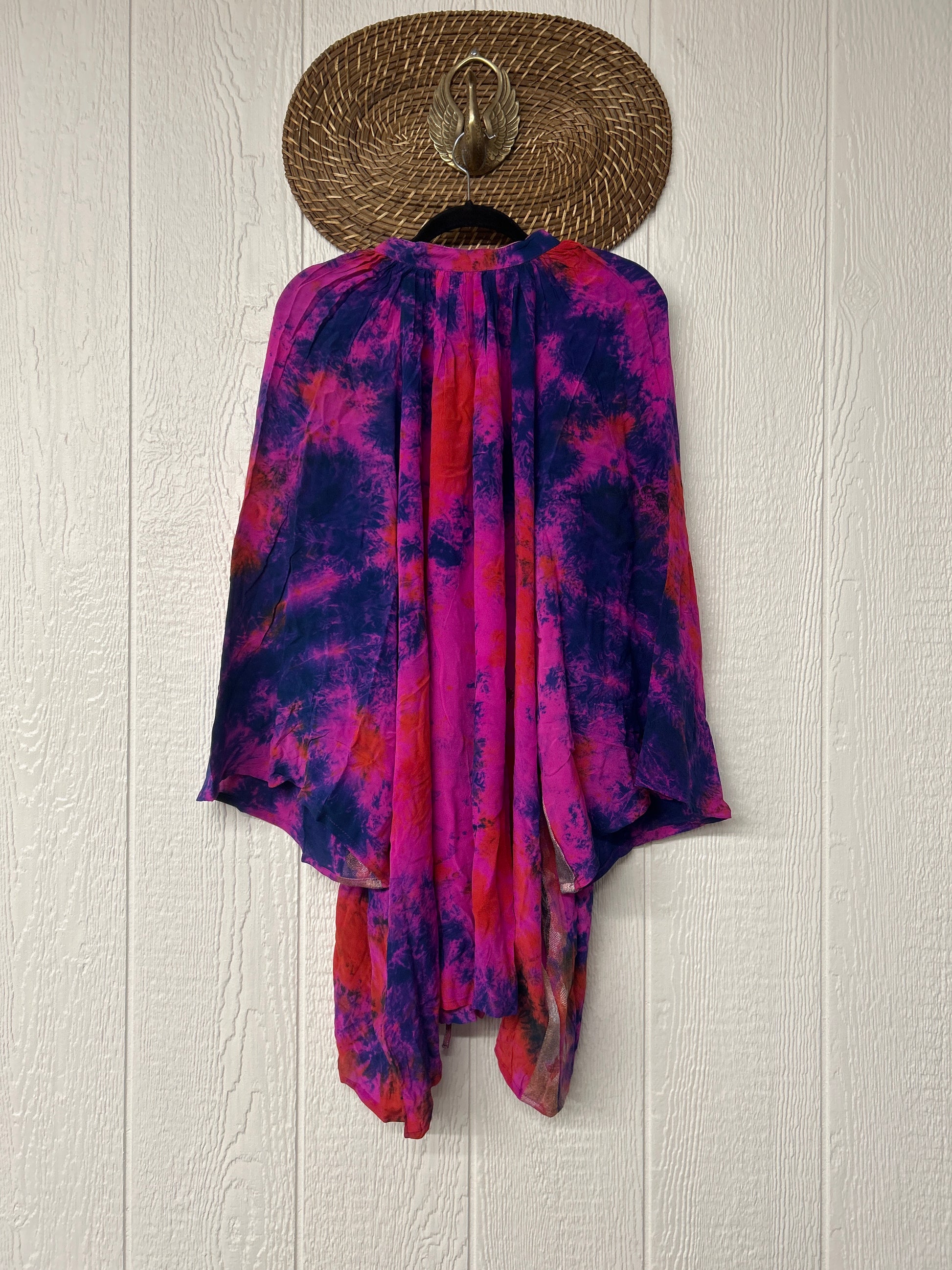 This floaty wonder is made from our ultra lux vintage crepe sari. Our India team has hand tie dyed these unique pieces in the dreamiest colors. The Woodstock Shortie Kimono can be buttoned up as a dress or worn open as the vibiest kimono. Wide bell sleeves make this statement piece the ultimate vibe!