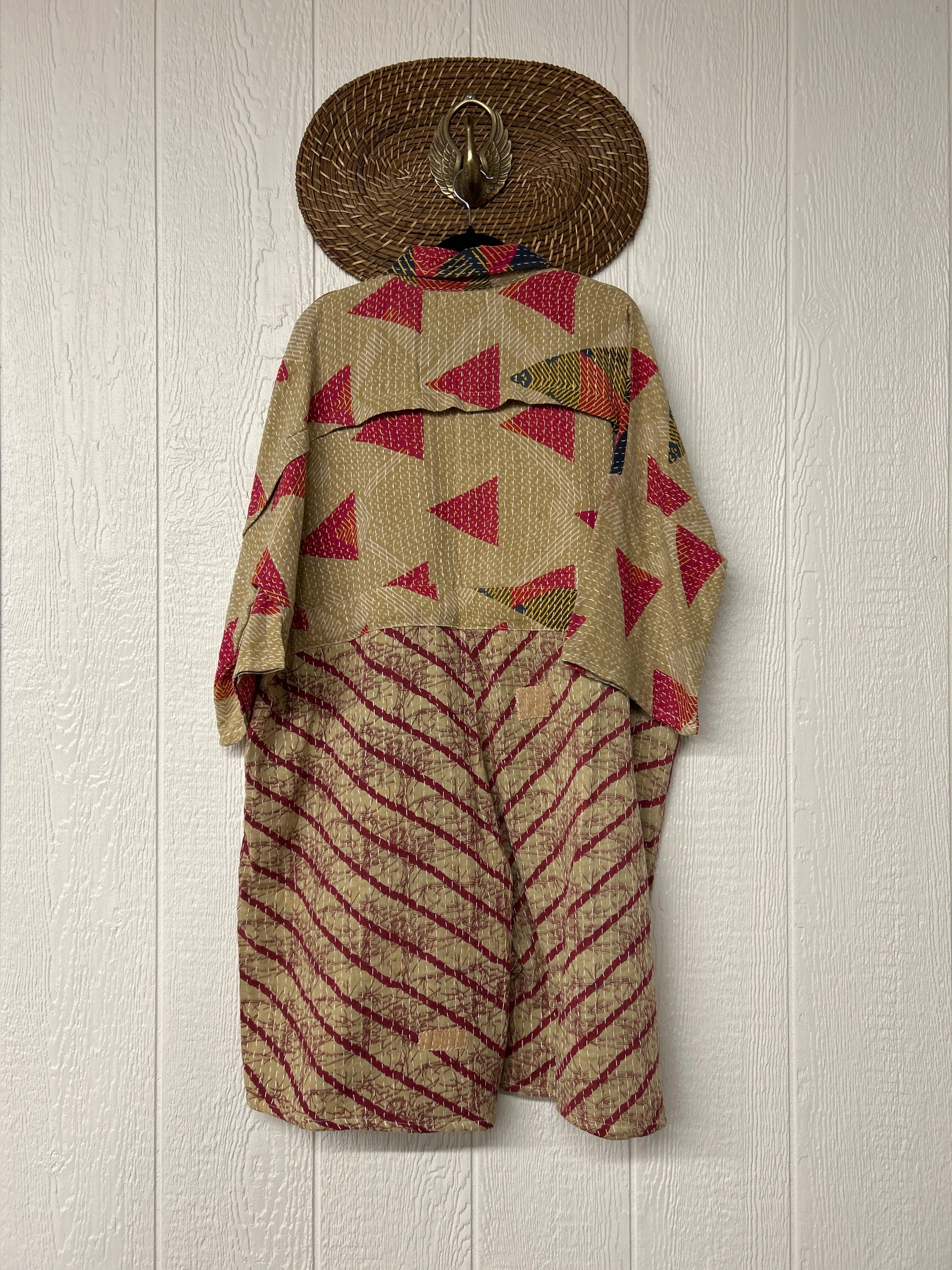 Fabrics may have small threads or holes in the layers. Color inconsistency or small stains may be present. The saris are sewn together and extend the life of each design. Imperfections should be celebrated.