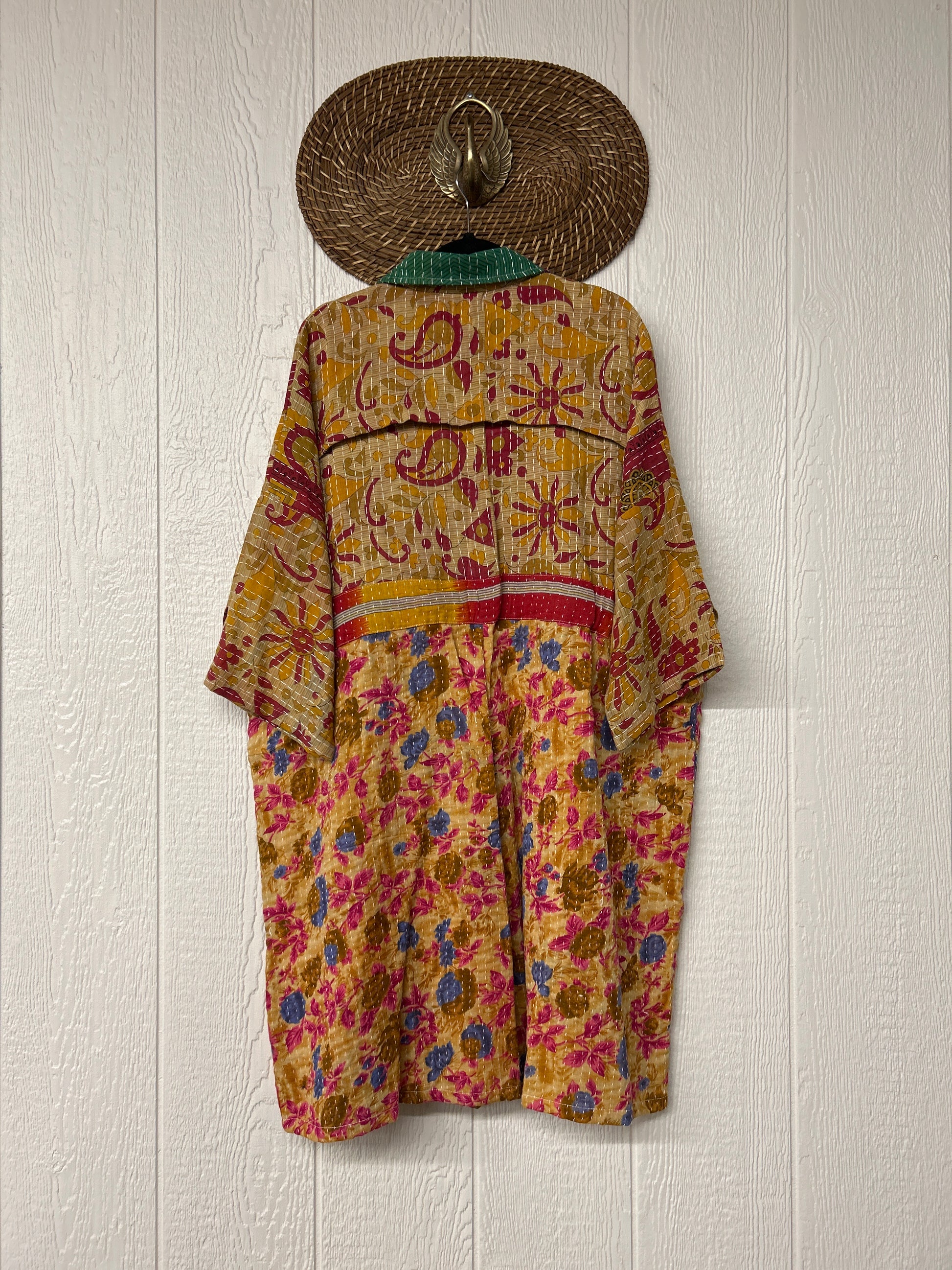 Fabrics may have small threads or holes in the layers. Color inconsistency or small stains may be present. The saris are sewn together and extend the life of each design. Imperfections should be celebrated.
