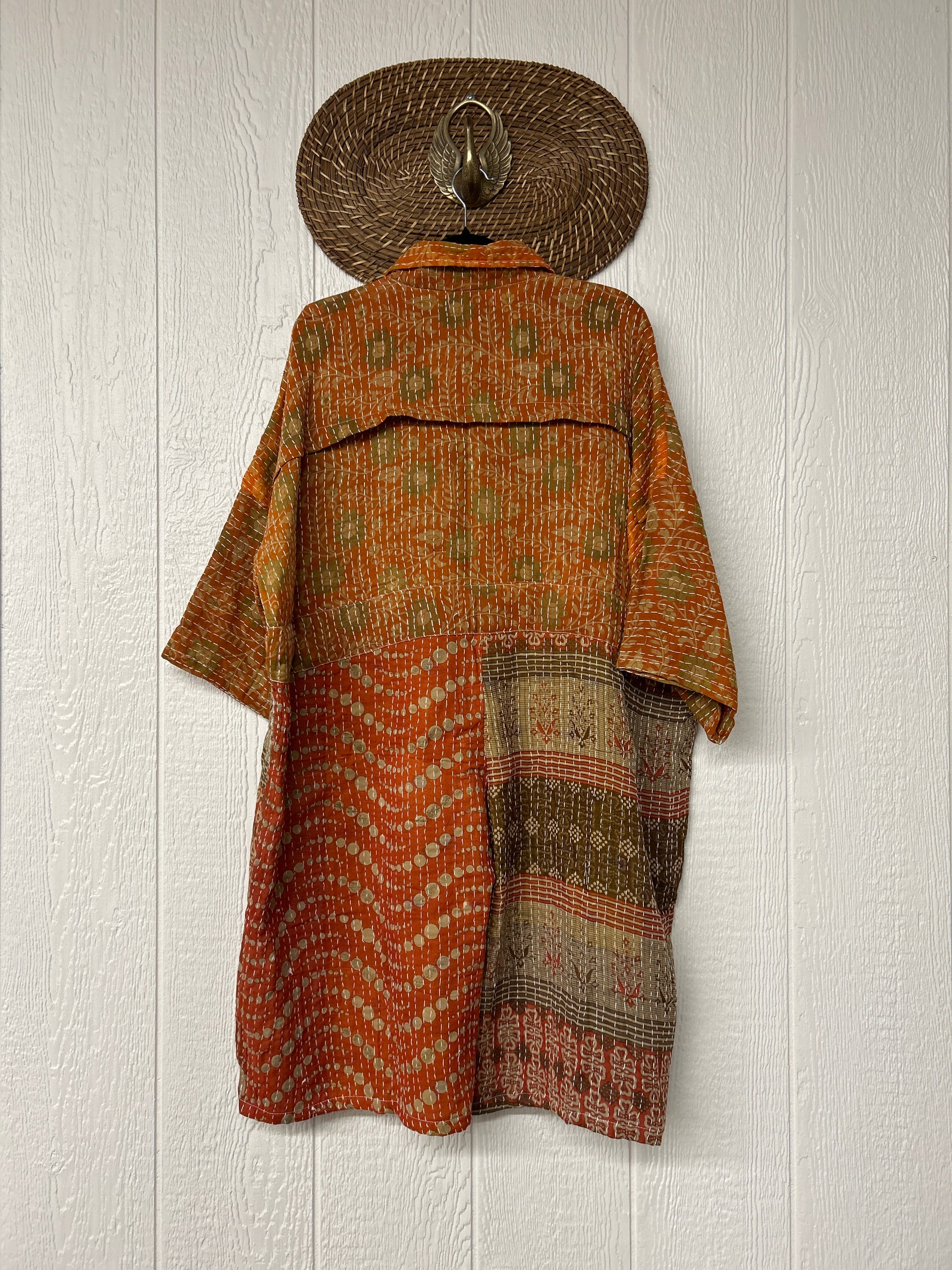 Fabrics may have small threads or holes in the layers. Color inconsistency or small stains may be present. The saris are sewn together and extend the life of each design. Imperfections should be celebrated.