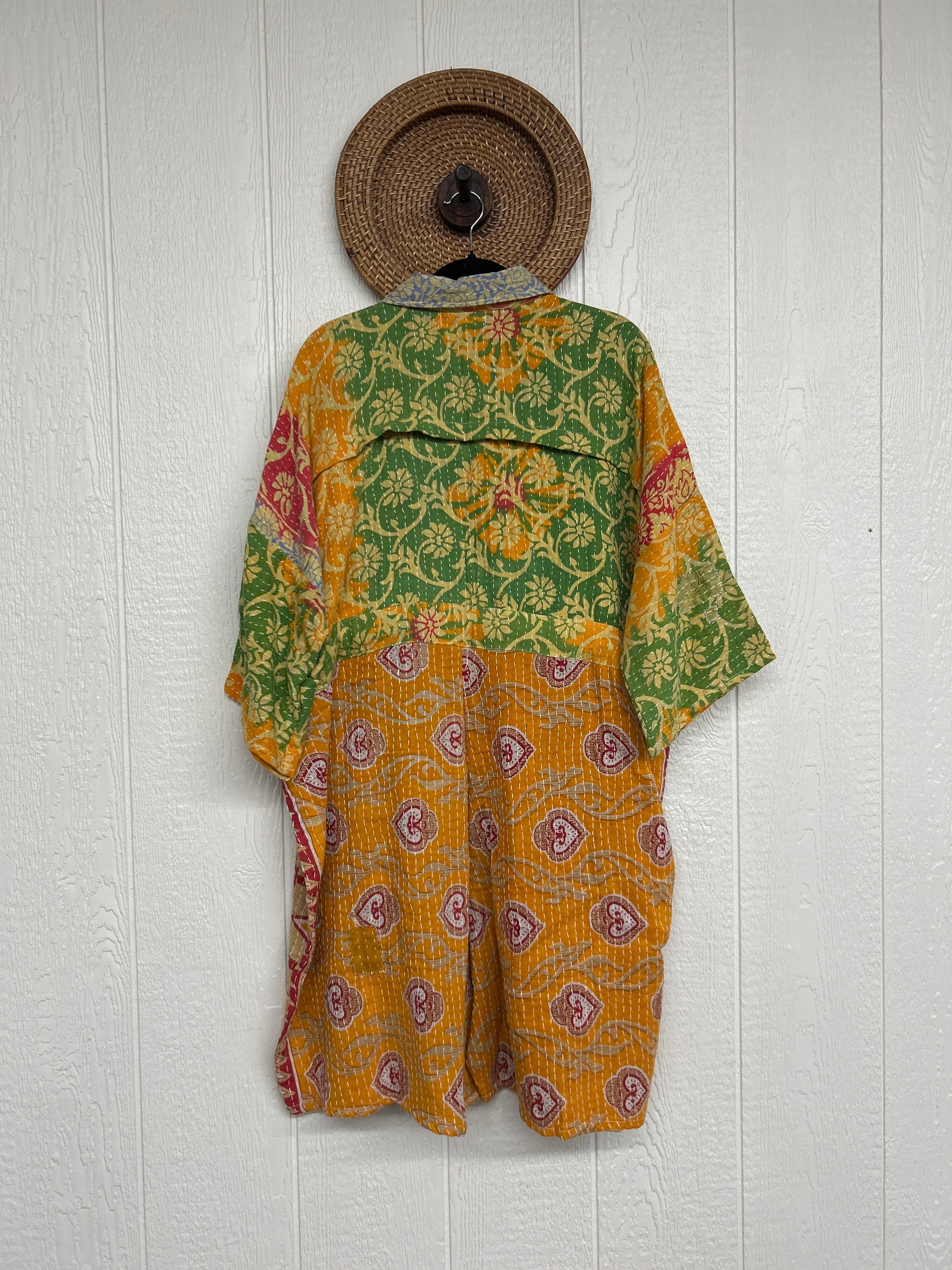 Fabrics may have small threads or holes in the layers. Color inconsistency or small stains may be present. The saris are sewn together and extend the life of each design. Imperfections should be celebrated.